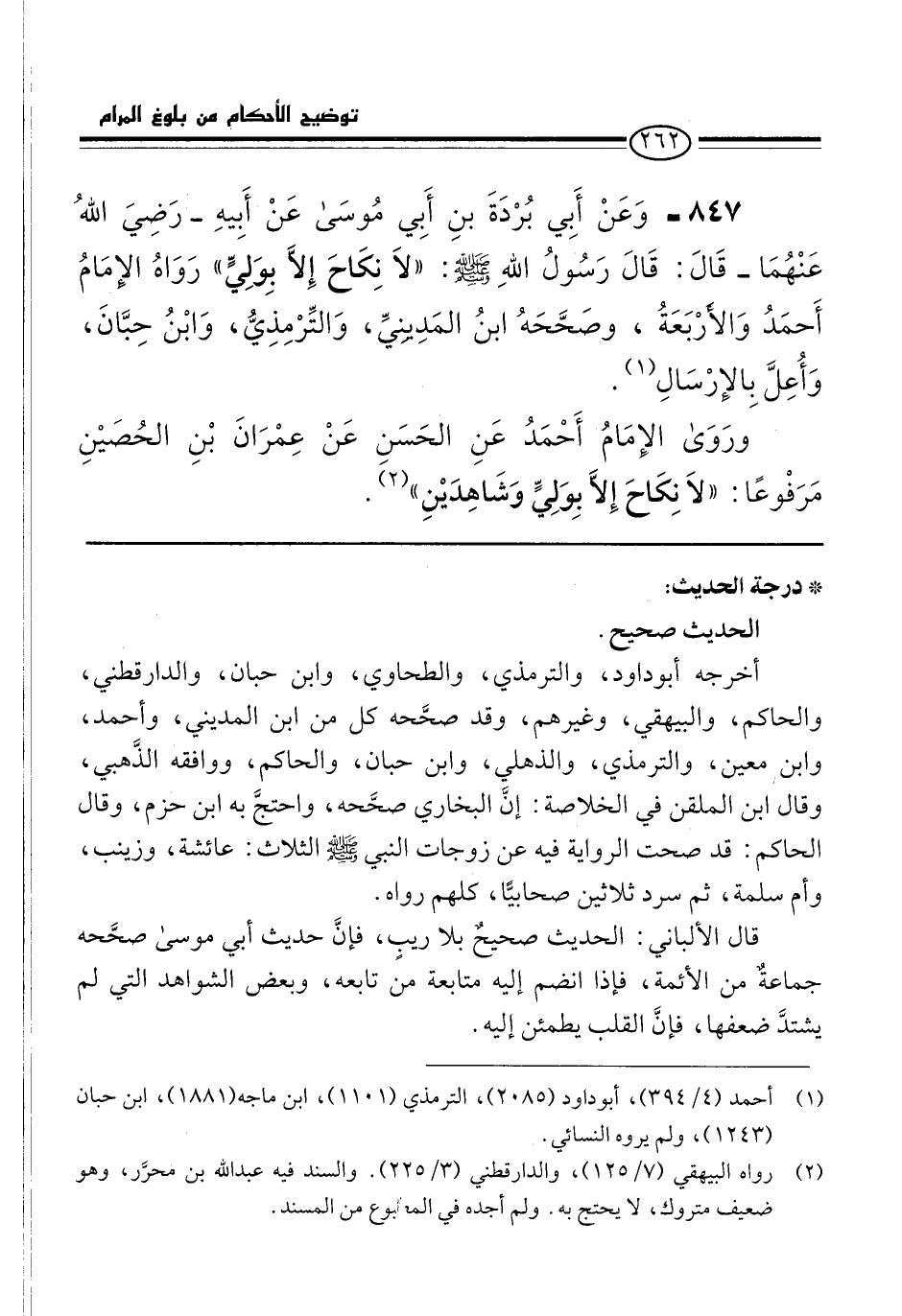 847 - وَعَنْ أَبِي بُرْدَةَ بنِ أِبي مُوسَى عَنْ أَبِيهِ -رَضِيَ اللهُ عَنْهُمَا- قَالَ: قَالَ رَسُولُ اللهِ -صلى الله عليه وسلم-: "لاَ نِكَاحَ إِلاَّ بِوَلِيٍّ" رَوَاهُ الإِمَامُ أَحمَدُ وَالأرْبَعَةُ، وصَحَّحَهُ ابنُ المَدِينِيِّ، وَالتِّرْمِذِيُّ، وَابْنُ حِبَّانَ، وَأُعِلَّ بِالإِرْسَالِ (¬1).