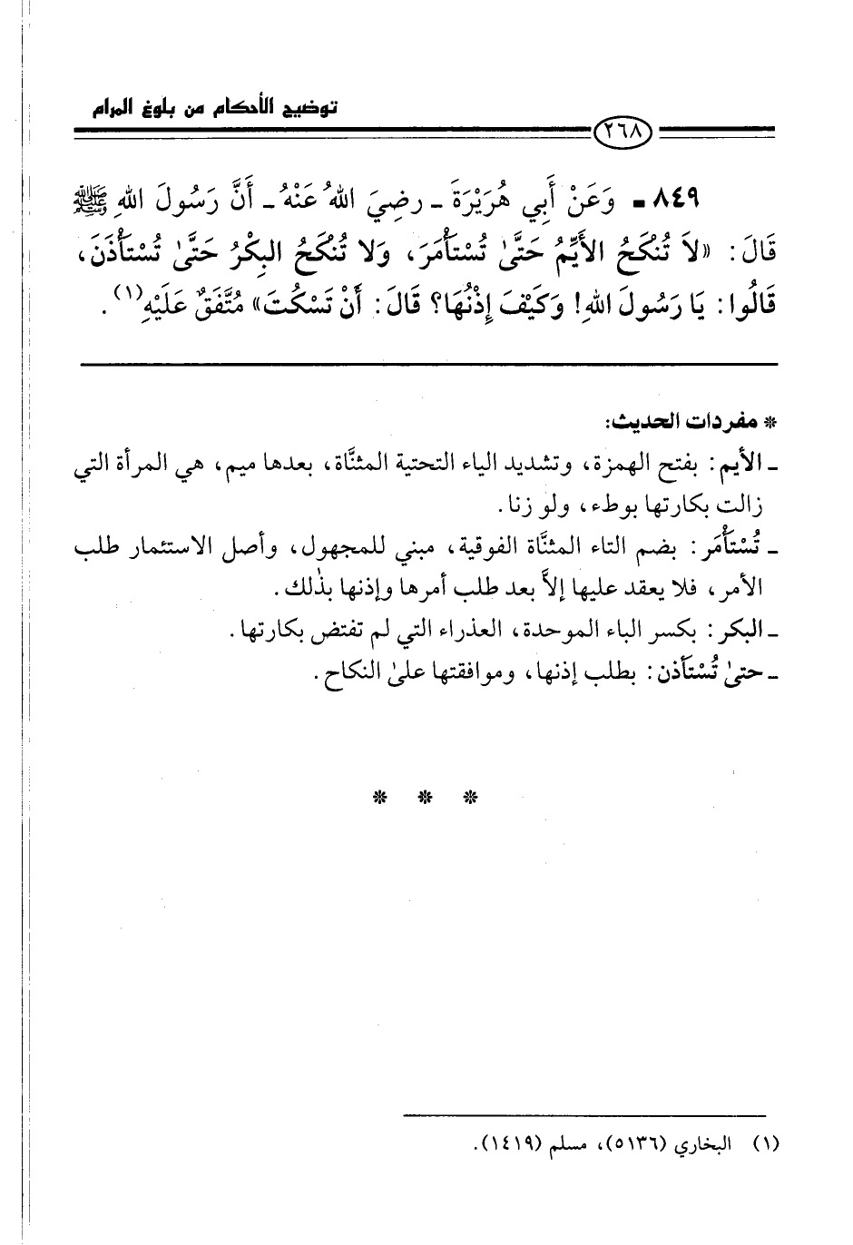 849 - وَعَنْ أَبِي هُرَيْرَةَ -رضِيَ اللهُ عَنْهُ- أَنَّ رَسُولَ اللهِ -صلى الله عليه وسلم- قَالَ: "لاَ تُنْكَحُ الأَيِّمُ حَتَّى تُسْتَأْمَرَ، وَلا تُنْكَحُ البِكْرُ حَتَّى تُسْتَأْذَنَ، قَالُوا: يَا رَسُولَ اللهِ! وَكيْفَ إِذْنُهَا؟ قَالَ: أَنْ تَسْكُتَ" مُتَّفَقٌ عَلَيْهِ (¬1).