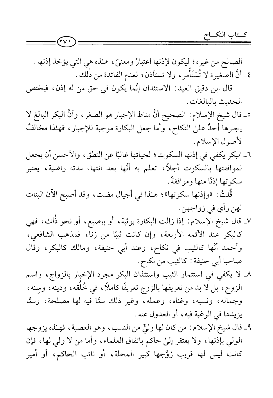 5 - قال شيخ الإِسلام: الصحيح أنَّ مناط الإجبار هو الصغر، وأنَّ البكر البالغ لا يجبرها أحدٌ على النكاح، وأما جعل البكارة موجبة للإجبار، فهذا مخالفٌ لأصول الإِسلام.