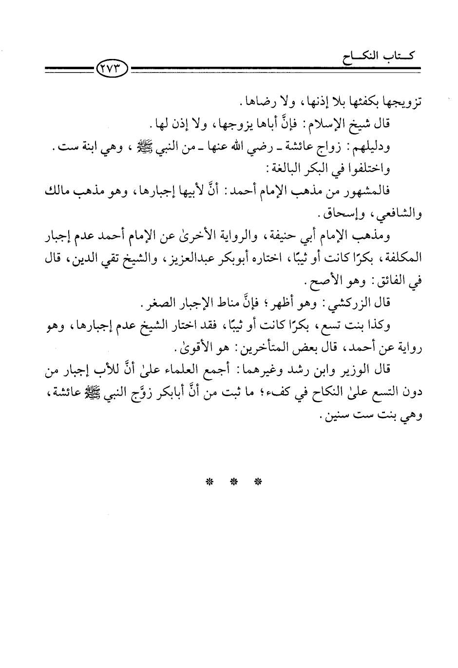 قال الوزير وابن رشد وغيرهما: أجمع العلماء على أنَّ للأب إجبار من دون التسع على النكاح في كفء؛ ما ثبت من أنَّ أبا بكر زوَّج النبي -صلى الله عليه وسلم- عائشة، وهي بنت ست سنين.