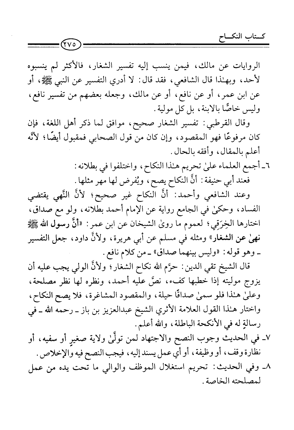 وقال القرطبي: تفسير الشغار صحيح، موافق لما ذكر أهل اللغة، فإن كان مرفوعًا فهو المقصود، وإن كان من قول الصحابي فمقبول أيضاً؛ لأنَّه أعلم بالمقال، وأفقه بالحال.