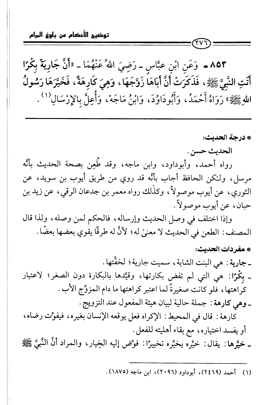 853 - وَعَنِ ابْنِ عبَّاسٍ -رَضِيَ اللهُ عَنْهُمَا- "أنَّ جَارِيَةً بِكْرًا أَتَتِ النَّبِيَّ -صلى الله عليه وسلم-، فَذَكرَتْ أَنَّ أَبَاهَا زَوَّجَهَا، وَهِيَ كَارِهَةٌ، فَخَيَّرَهَا رَسُولُ اللهِ -صلى الله عليه وسلم-" رَوَاهُ أَحْمَدُ، وَأَبُو دَاوُدَ، وَابْنُ مَاجَهْ، وَأُعِلَّ بِالإِرْسَالِ (¬1).
