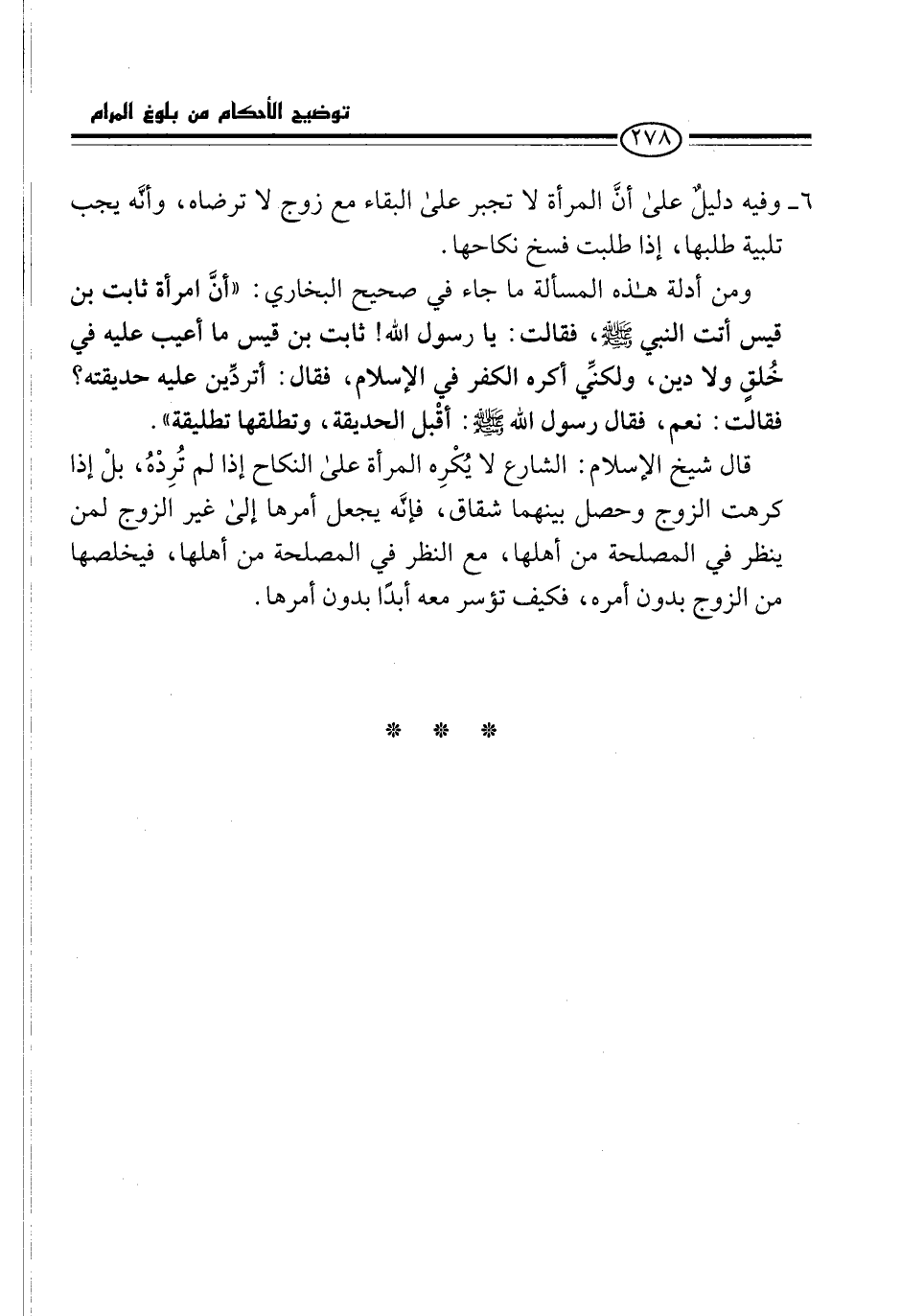 6 - وفيه دليلٌ على أنَّ المرأة لا تجبر على البقاء مع زوج لا ترضاه، وأنَّه يجب تلبية طلبها، إذا طلبت فسخ نكاحها.
