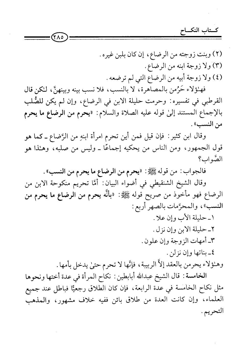 وقال الشيخ الشنقيطي في أضواء البيان: أمَّا تحريم منكوحة الابن من الرضاع فهو مأخوذ من صريح قوله -صلى الله عليه وسلم-: "بأنَّه يحرم من الرضاع ما يحرم من النسب"، والمحرَّمات بالصهر أربع: