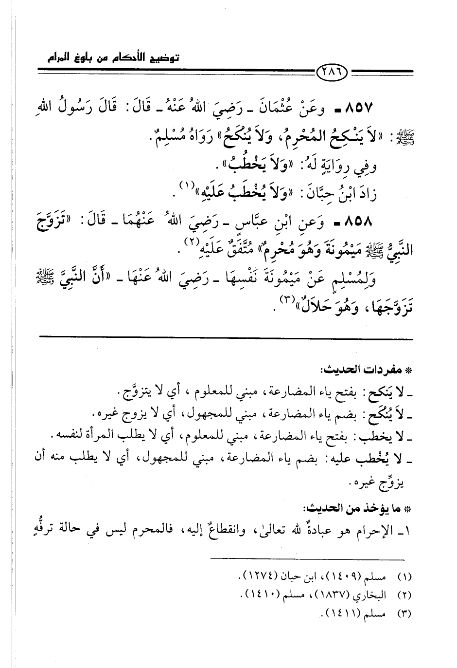 857 - وَعَنْ عُثْمَانَ -رضي الله عنه- قَالَ: قَالَ رَسُولُ اللَّهِ -صلى الله عليه وسلم-: "لَا يَنْكِحُ الْمُحْرِمُ, وَلَا يُنْكَحُ" رَوَاهُ مُسْلِمٌ.