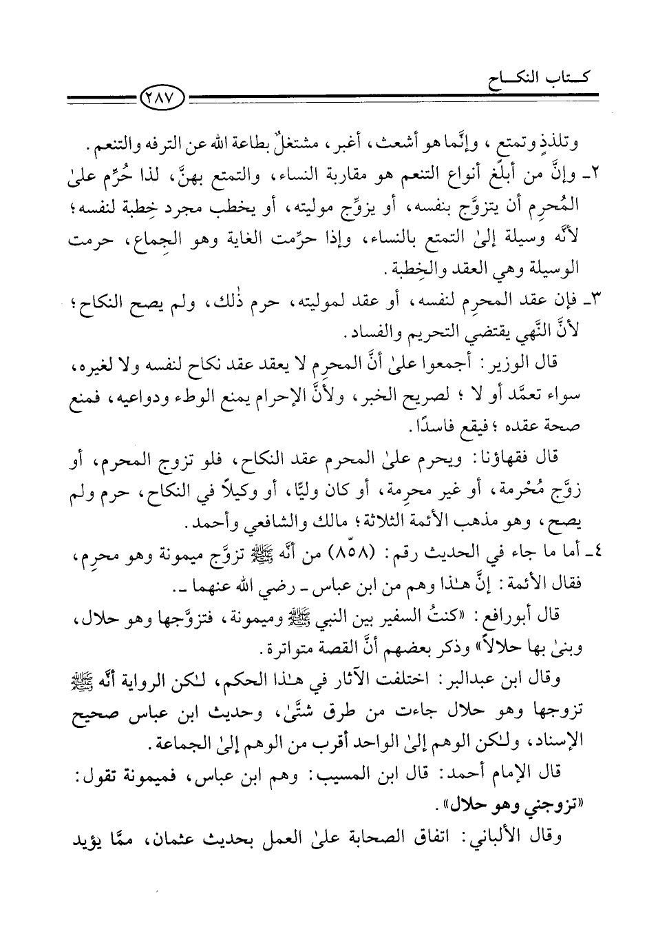 وقال ابن عبد البر: اختلفت الآثار في هذا الحكم، لكن الرواية أنَّه -صلى الله عليه وسلم- تزوجها وهو حلال جاءت من طرق شتَّى، وحديث ابن عباس صحيح الإسناد، ولكن الوهم إلى الواحد أقرب من الوهم إلى الجماعة.
