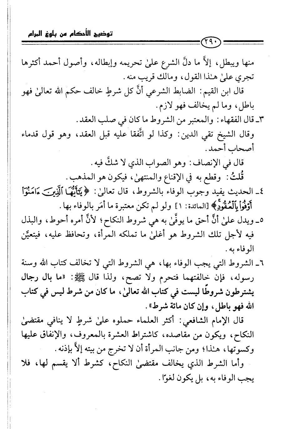 6 - الشروط التي يجب الوفاء بها، هي الشروط التي لا تخالف كتاب الله وسنة رسوله، فإن خالفتهما فتحرم ولا تصح، ولذا قال -صلى الله عليه وسلم-: "ما بال رجال يشترطون شروطًا ليست في كتاب الله تعالى، ما كان من شرط ليس في كتاب الله فهو باطل، وإن كان مائة شرط".