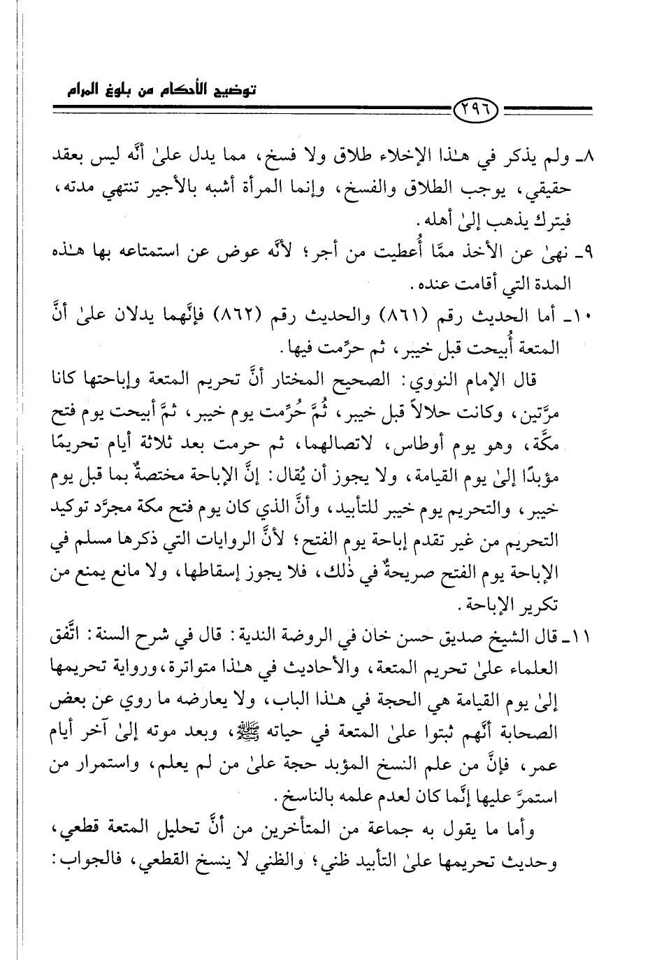 11 - قال الشيخ صديق حسن خان في الروضة الندية: قال في شرح السنة: اتَّفق العلماء على تحريم المتعة، والأحاديث في هذا متواترة، ورواية تحريمها إلى يوم القيامة هي الحجة في هذا الباب، ولا يعارضه ما روي عن بعض الصحابة أنَّهم ثبتوا على المتعة في حياته -صلى الله عليه وسلم-، وبعد موته إلى آخر أيام عمر، فإنَّ من علم النسخ المؤبد حجة على من لم يعلم، واستمرار من استمرَّ عليها إنَّما كان لعدم علمه بالناسخ.