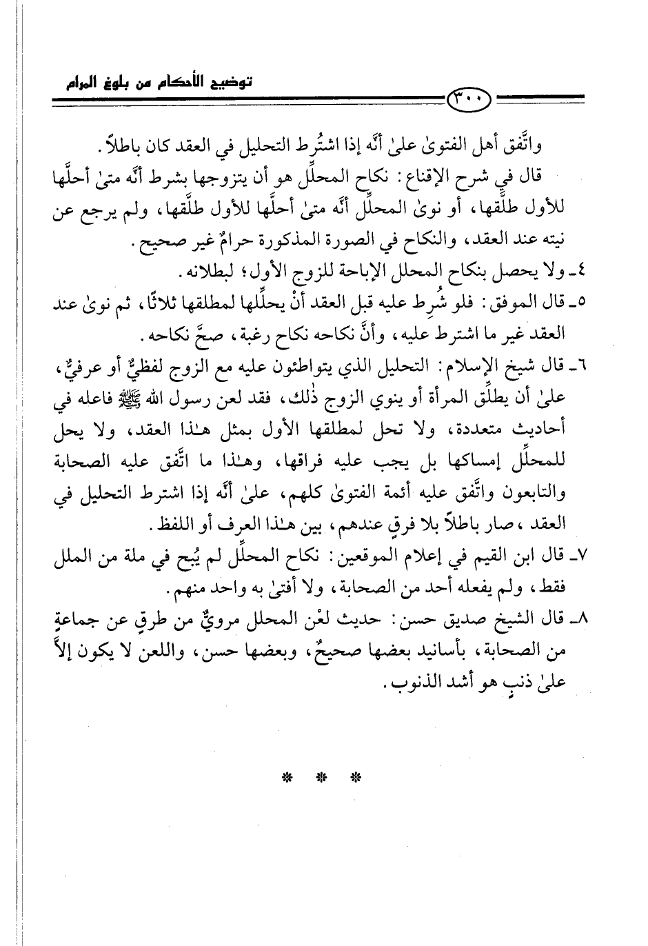 8 - قال الشيخ صديق حسن: حديث لعْن المحلل مرويٌّ من طرقٍ عن جماعةٍ من الصحابة، بأسانيد بعضها صحيحٌ، وبعضها حسن، واللعن لا يكون إلاَّ على ذنبٍ هو أشد الذنوب.