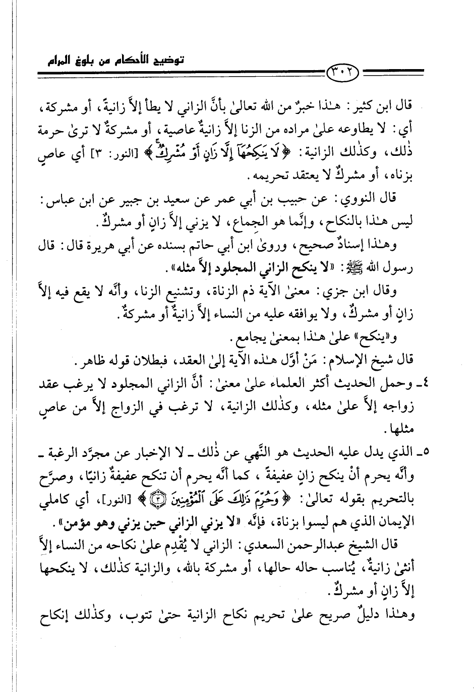 قال الشيخ عبد الرحمن السعدي: الزاني لا يُقْدِم على نكاحه من النساء إلاَّ أنثى زانيةٌ، يُناسب حاله حالها، أو مشركة بالله، والزانية كذلك، لا ينكحها إلاَّ زانٍ أو مشركٌ.