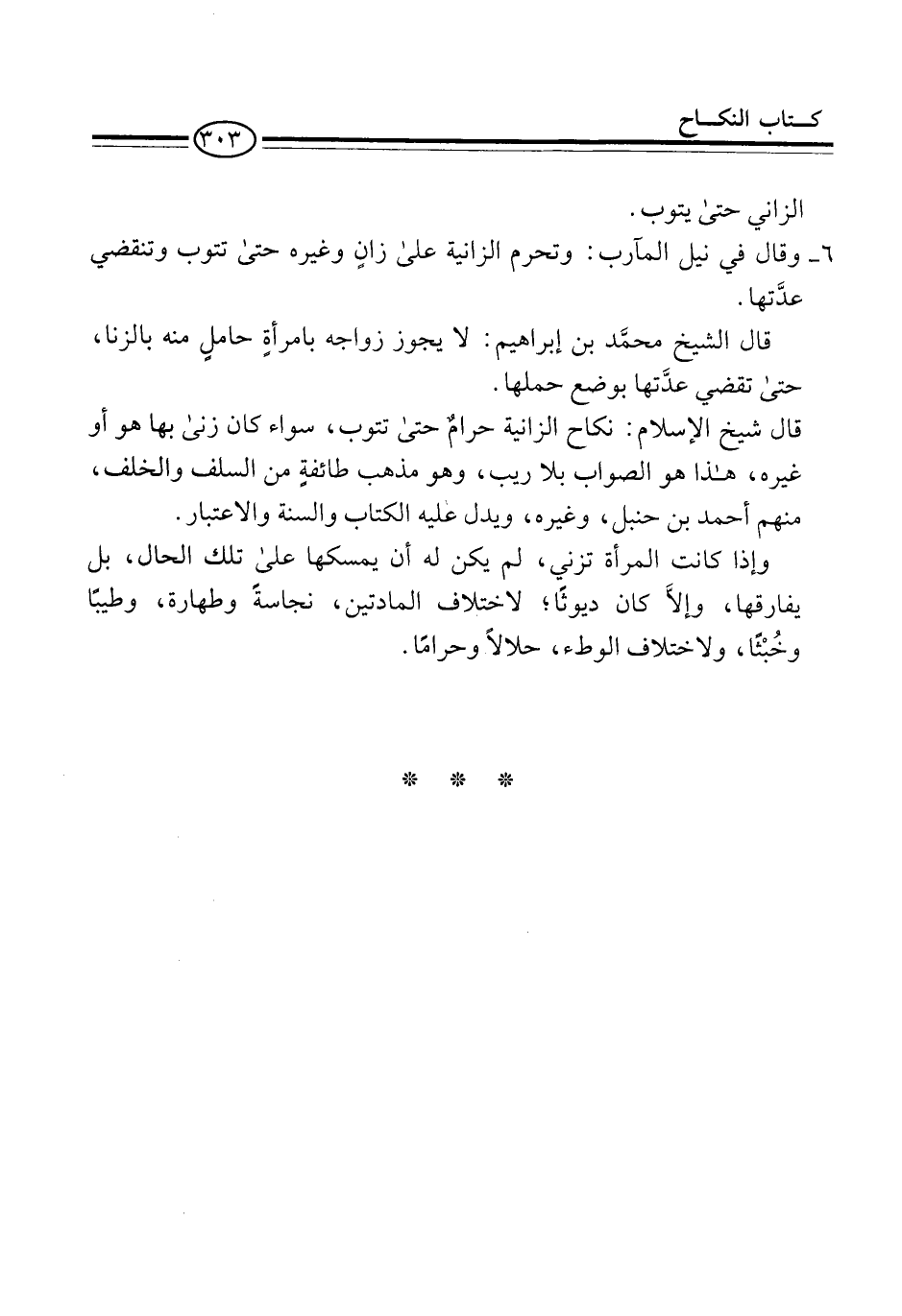 6 - وقال في نيل المآرب: وتحرم الزانية على زانٍ وغيره حتى تتوب وتنقضي عدَّتها.
