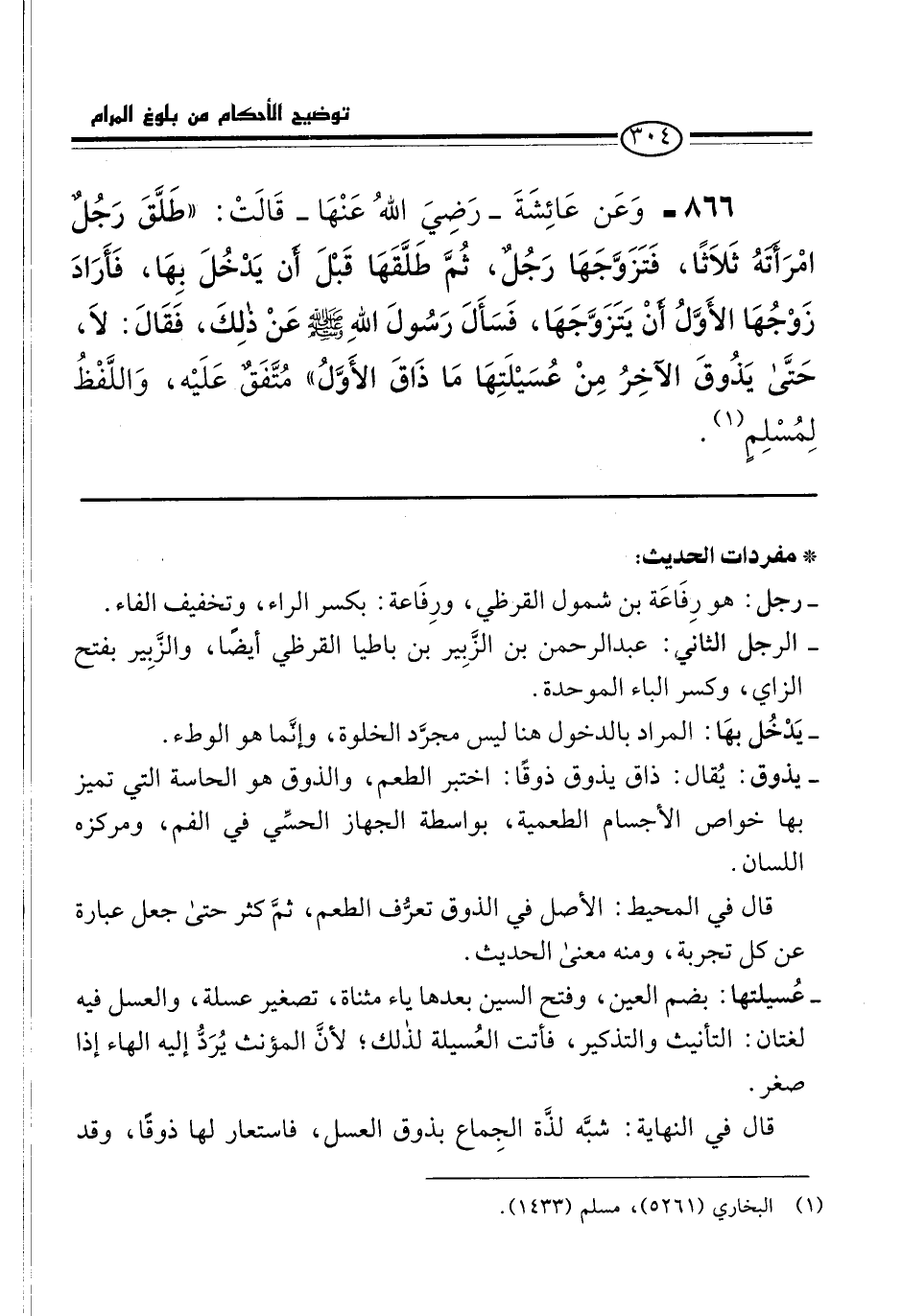 866 - وَعَنْ عَائِشَةَ -رَضِيَ اللَّهُ عَنْهَا- قَالَتْ: "طَلَّقَ رَجُلٌ امْرَأَتَهُ ثَلَاثًا, فَتَزَوَّجَهَا رَجُلٌ, ثُمَّ طَلَّقَهَا قَبْلَ أَنْ يَدْخُلَ بِهَا, فَأَرَادَ زَوْجُهَا الأَوَّلُ أَنْ يَتَزَوَّجَهَا, فَسَأَلَ رَسُولُ اللَّهِ -صلى الله عليه وسلم- عَنْ ذَلِكَ, فَقَالَ: لَا. حَتَّى يَذُوقَ الْآخِرُ مِنْ عُسَيْلَتِهَا مَا ذَاقَ الأَوَّلُ". مُتَّفَقٌ عَلَيْهِ, وَاللَّفْظُ لِمُسْلِمٍ (¬1).