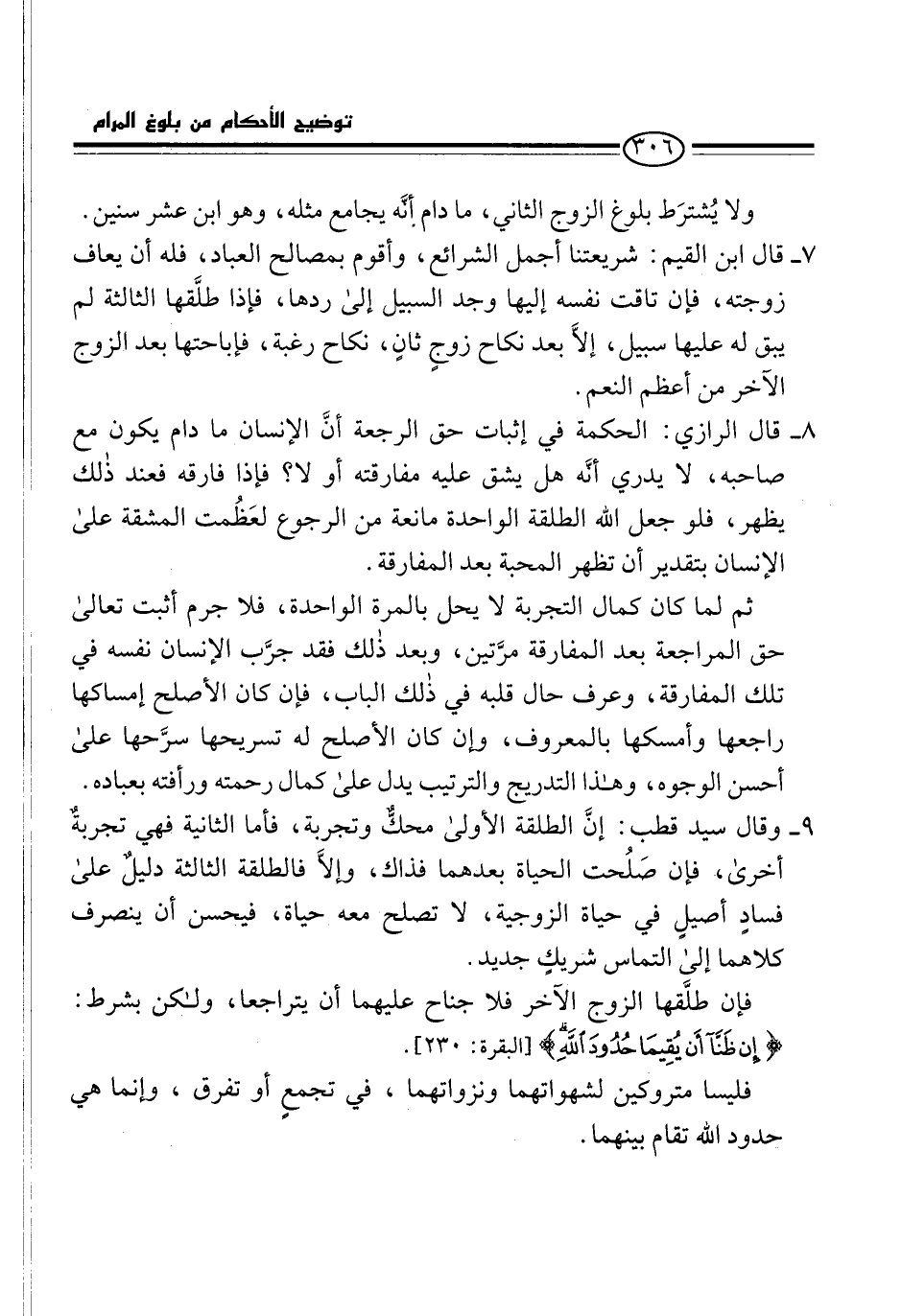 9 - وقال سيد قطب: إنَّ الطلقة الأولى محكٌّ وتجربة، فأما الثانية فهي تجربةٌ أخرى، فإن صَلُحت الحياة بعدهما فذاك، وإلاَّ فالطلقة الثالثة دليلٌ على فسادٍ أصيلٍ في حياة الزوجية، لا تصلح معه حياة، فيحسن أن ينصرف كلاهما إلى التماس شريكٍ جديد.
