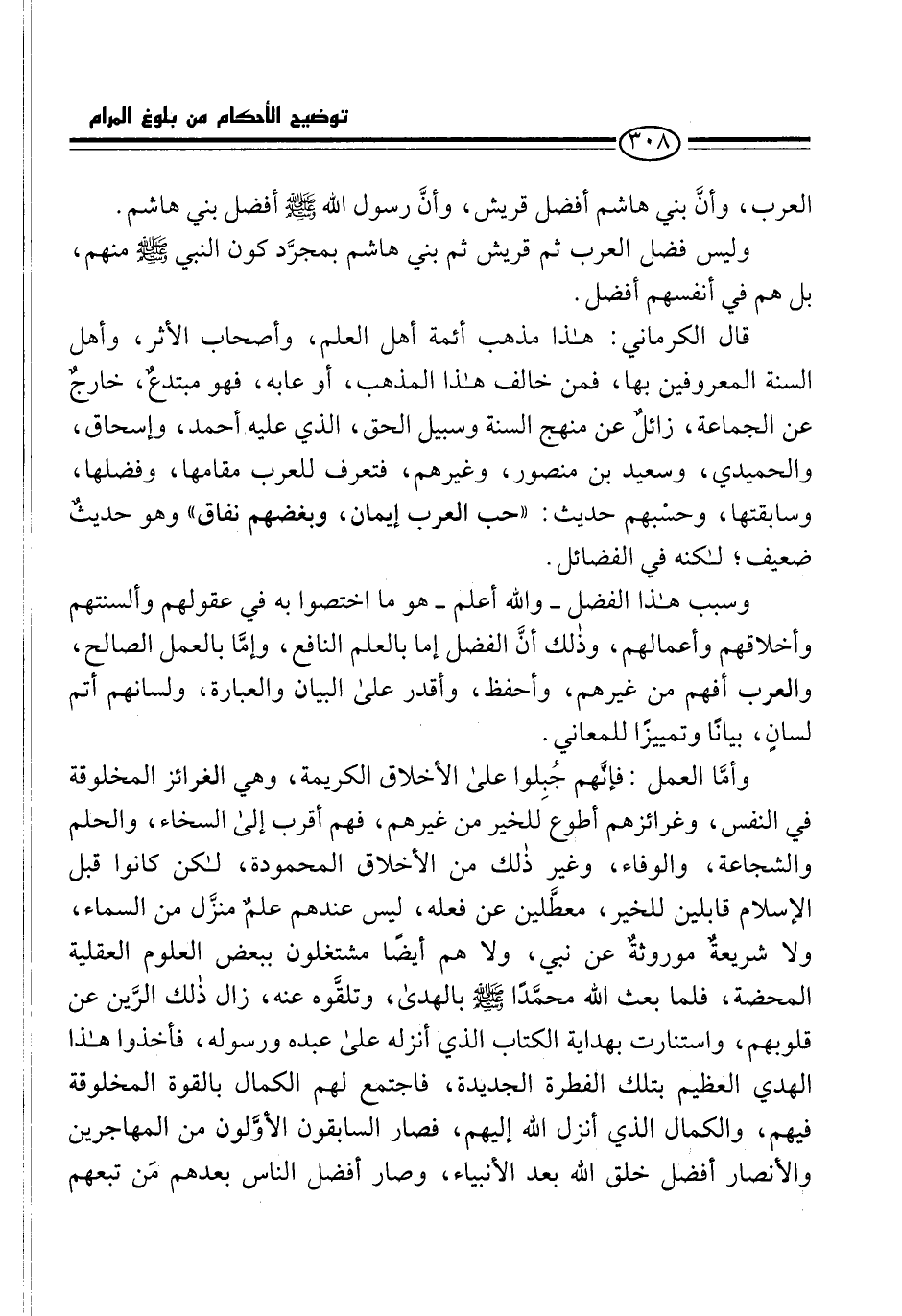 قال الكرماني: هذا مذهب أئمة أهل العلم، وأصحاب الأثر، وأهل السنة المعروفين بها، فمن خالف هذا المذهب، أو عابه، فهو مبتدعٌ، خارجٌ عن الجماعة، زائلٌ عن منهج السنة وسبيل الحق، الذي عليه أحمد، وإسحاق، والحميدي، وسعيد بن منصور، وغيرهم، فتعرف للعرب مقامها، وفضلها، وسابقتها، وحسْبهم حديث: "حب العرب إيمان، وبغضهم نفاق" وهو حديثٌ ضعيف؛ لكنه في الفضائل.