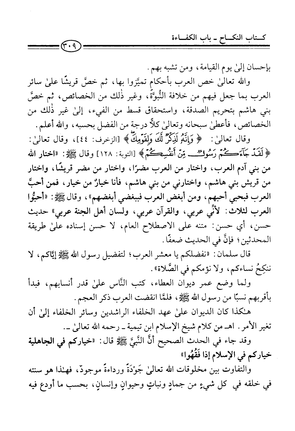 والله تعالى خص العرب بأحكامٍ تميَّزوا بها، ثم خصَّ قريشًا على سائر العرب بما جعل فيهم من خلافة النُّبوَّة، وغير ذلك من الخصائص، ثم خصَّ بني هاشم بتحريم الصدقة، واستحقاق قسط من الفيء، إلى غير ذلك من الخصائص، فأعطى سبحانه وتعالى كلاًّ درجة من الفضل بحسبه، والله أعلم.