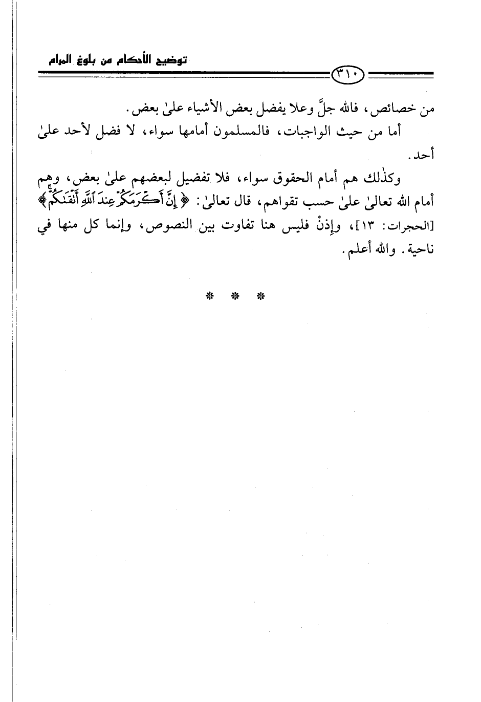 وكذلك هم أمام الحقوق سواء، فلا تفضيل لبعضهم على بعض، وهم أمام الله تعالى على حسب تقواهم، قال تعالى: {إِنَّ أَكْرَمَكُمْ عِنْدَ اللَّهِ أَتْقَاكُمْ} [الحجرات: 13]، وإِذنْ فليس هنا تفاوت بين النصوص، وإنما كل منها في ناحية. والله أعلم.