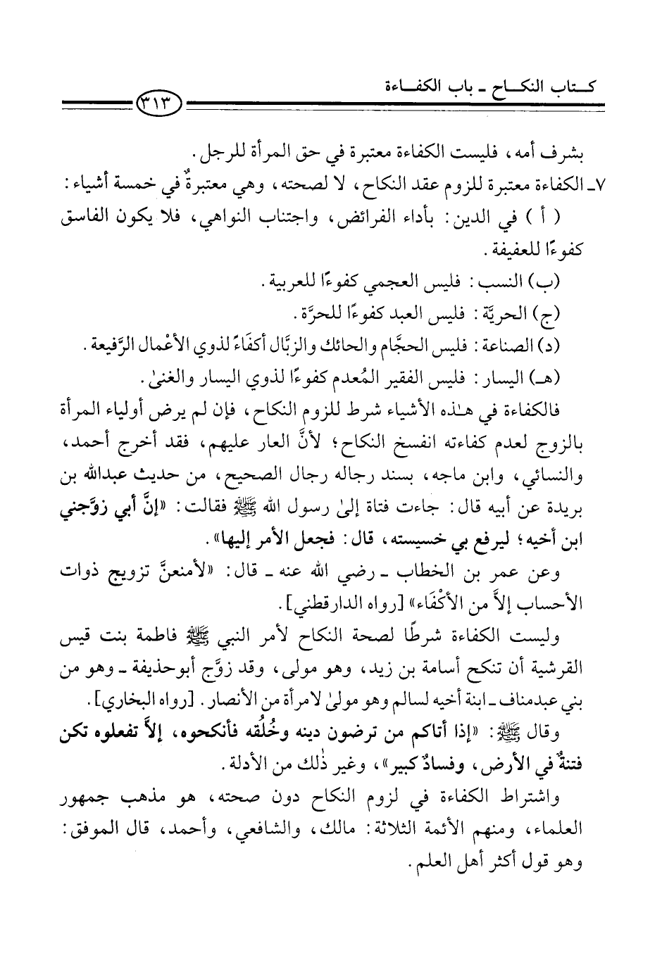 7 - الكفاءة معتبرة للزوم عقد النكاح، لا لصحته، وهي معتبرةٌ في خمسة أشياء: