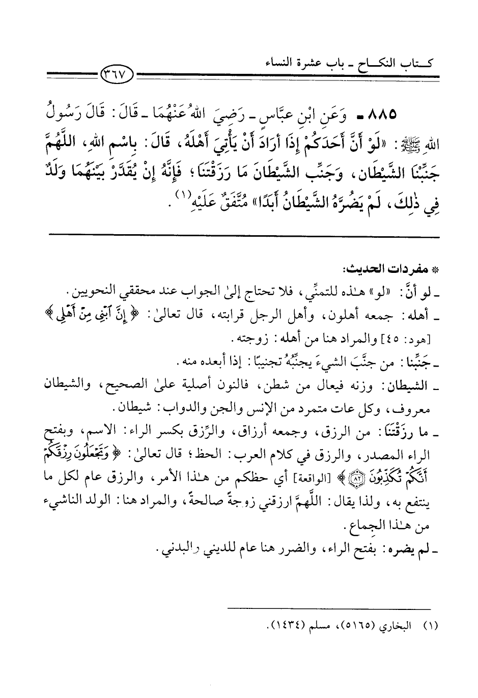 885 - وَعَنِ ابْنِ عَبَّاسٍ -رَضِيَ اللَّهُ عَنْهُمَا- قَالَ: قَالَ رَسُولُ اللَّهِ -صلى الله عليه وسلم-: "لَوْ أَنَّ أَحَدَكُمْ إِذَا أَرَادَ أَنْ يَأْتِيَ أَهْلَهُ قَالَ: بِسْمِ اللَّهِ، اللَّهُمَّ جَنِّبْنَا الشَّيْطَانَ وَجَنِّبِ الشَّيْطَانَ مَا رَزَقْتَنَا; فَإِنَّهُ إِنْ يُقَدَّرْ بَيْنَهُمَا وَلَدٌ فِي ذَلِكَ, لَمْ يَضُرَّهُ الشَّيْطَانُ أَبَدًا". مُتَّفَقٌ عَلَيْهِ (¬1).