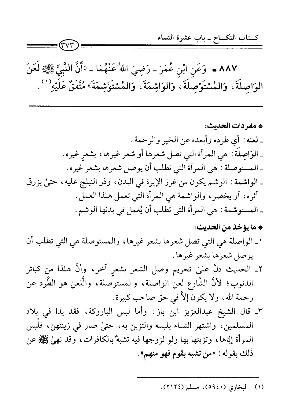887 - وَعَنِ ابْنِ عُمَرَ -رَضِيَ اللَّهُ عَنْهُمَا- "أَنَّ النَّبِيَّ -صلى الله عليه وسلم- لَعَنَ الوَاصِلَةَ، وَالمُسْتَوْصِلَةَ, وَالوَاشِمَةَ، وَالمُسْتَوْشِمَةَ" مُتَّفَقٌ عَلَيْهِ (¬1).