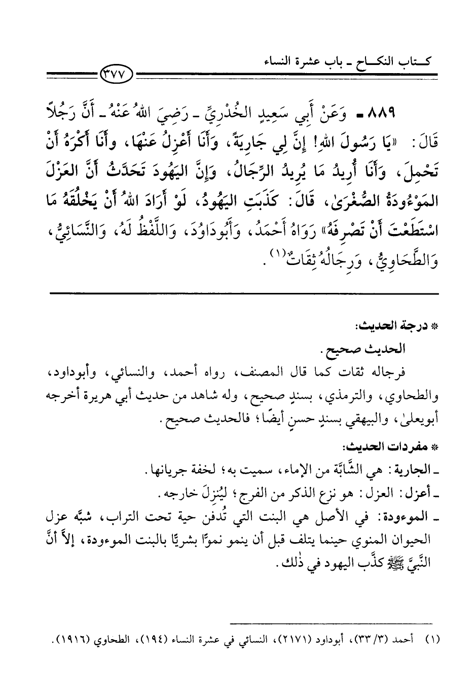 889 - وَعَنْ أَبِي سَعِيدٍ الخُدْرِيِّ -رَضِيَ اللهُ عَنْهُ- أَنَّ رَجُلاً قَالَ: "يَا رَسُولَ اللهِ! إِنَّ لِي جَارِيَةً، وَأَنَا أَعْزِلُ عَنْهَا، وأَنَا أَكْرَهُ أَنْ تَحْمِلَ، وَأَنَا أُرِيدُ مَا يُرِيدُ الرِّجَالُ، وَإِنَّ اليَهُودَ تَحَدَّثُ أنَّ العَزْلَ المَوْءُودَةُ الصُّغْرَى، قَالَ: كَذَبَتِ اليَهُودُ، لَوْ أَرَادَ اللهُ أَنْ يَخلُقَهُ مَا اسْتَطَعْتَ أَنْ تَصْرِفَهُ" رَوَاهُ أَحْمَدُ، وَأَبُو دَاوُدَ، وَاللَّفْظُ لَهُ، وَالنَّسَائِيُّ، وَالطَّحَاوِيُّ، وَرِجَالُهُ ثِقَاتٌ (¬1).