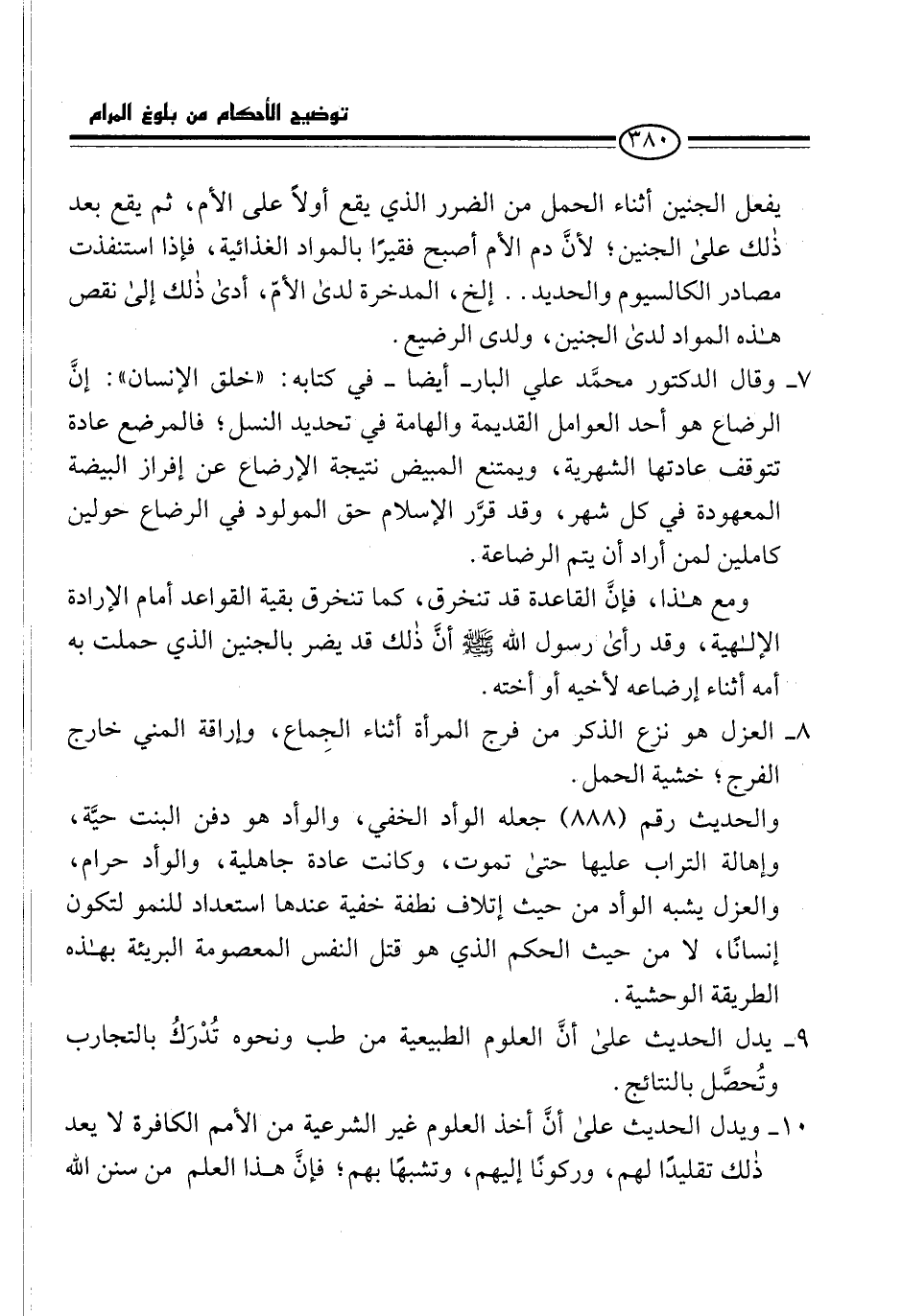 7 - وقال الدكتور محمَّد علي البار -أيضا- في كتابه: "خلق الإنسان": إنَّ الرضاع هو أحد العوامل القديمة والهامة في تحديد النسل؛ فالمرضع عادة تتوقف عادتها الشهرية، ويمتنع المبيض نتيجة الإرضاع عن إفراز البيضة المعهودة في كل شهر، وقد قرَّر الإسلام حق المولود في الرضاع حولين كاملين لمن أراد أن يتم الرضاعة.