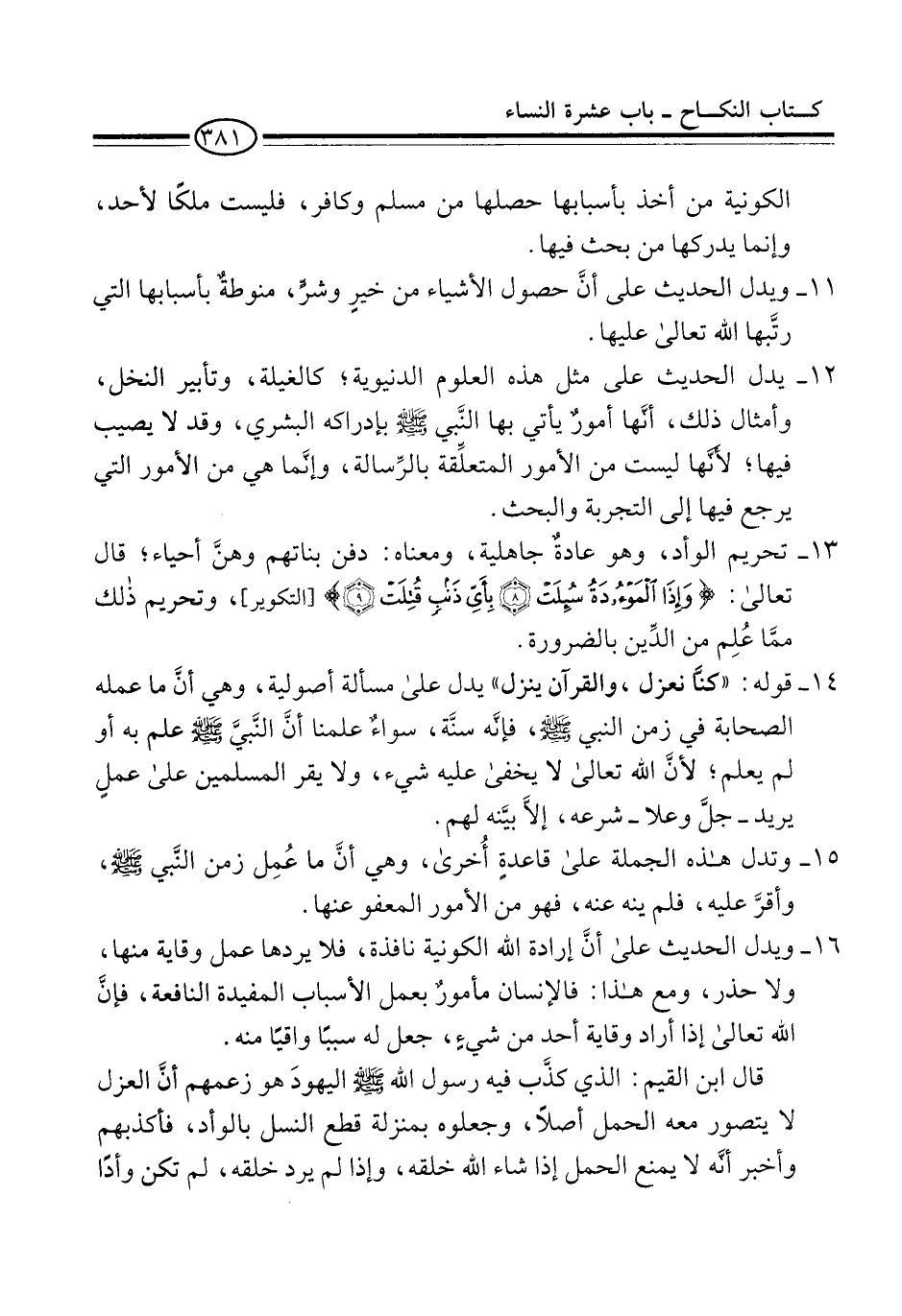 14 - قوله: "كنَّا نعزل، والقرآن ينزل" يدل على مسألة أصولية، وهي أنَّ ما عمله الصحابة في زمن النبي -صلى الله عليه وسلم-، فإنَّه سنَّة، سواءٌ علمنا أنَّ النَّبيَّ -صلى الله عليه وسلم- علم به أو لم يعلم؛ لأنَّ الله تعالى لا يخفى عليه شيء، ولا يقر المسلمين على عملٍ يريد -جلَّ وعلا- شرعه، إلاَّ بيَّنه لهم.