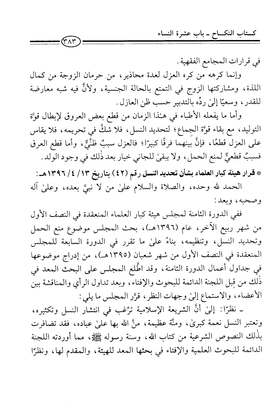 * قرار هيئة كبار العلماء بشأن تحديد النسل رقم (42) بتاريخ 13/ 4/ 1396 هـ: