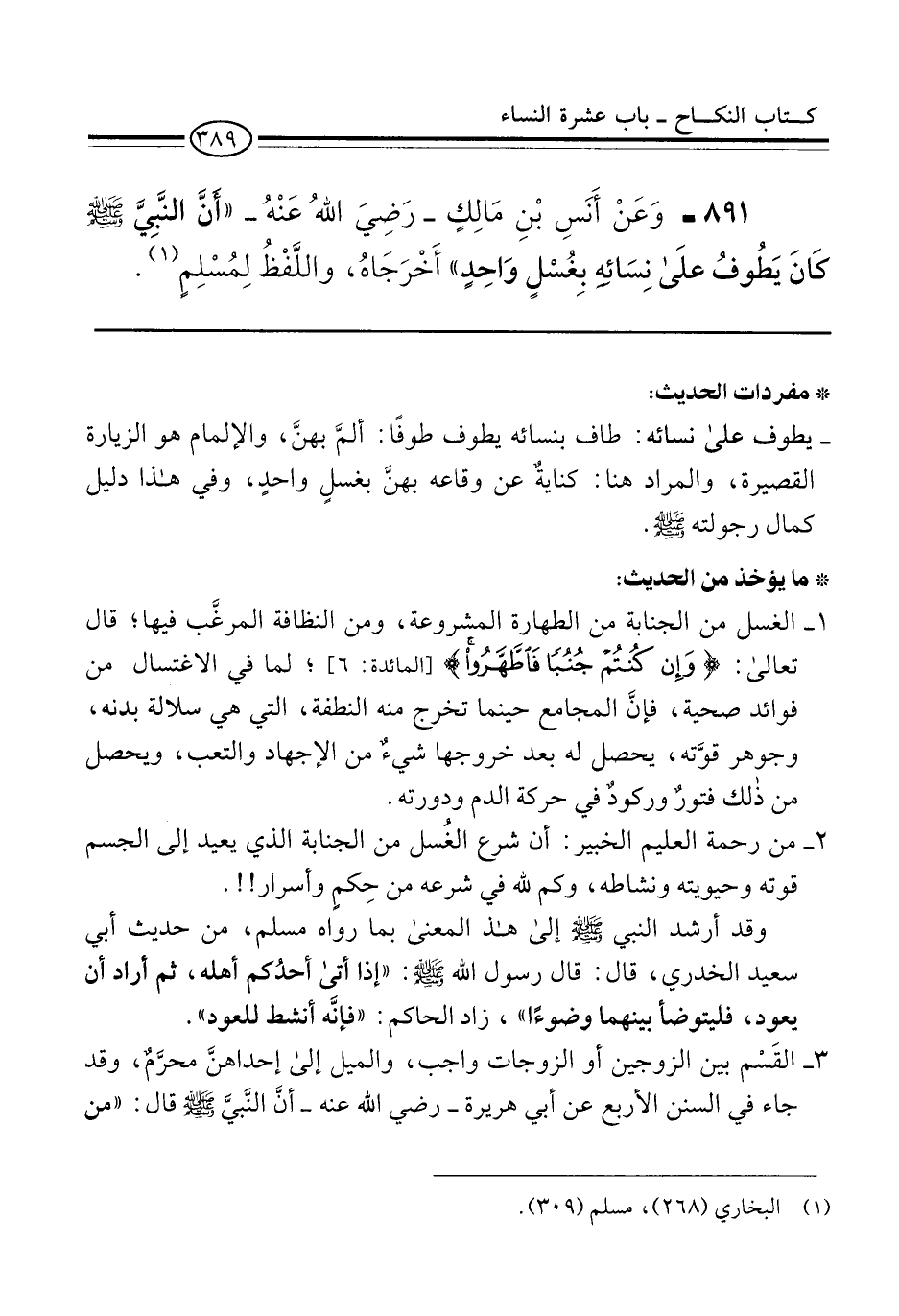 891 - وَعَنْ أَنَسِ بْنِ مَالِكٍ -رَضيَ اللهُ عَنْهُ- "أَنَّ النَّبِيَّ -صلى الله عليه وسلم- كَانَ يَطُوفُ علَى نِسَائِه بِغُسْلٍ وَاحِدٍ" أَخْرَجَاهُ، واللَّفْظُ لِمُسْلِمٍ (¬1).