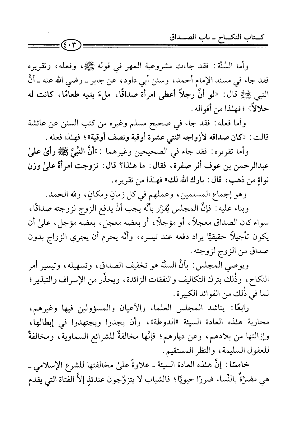 ويوصي المجلس: بأنَّ السنَّة هو تخفيف الصداق، وتسهيله، وتيسير أمر النكاح، وذلك بترك التكاليف والنفقات الزائدة، ويحذِّر من الإسراف والتبذير؛ لما في ذلك من الفوائد الكبيرة.