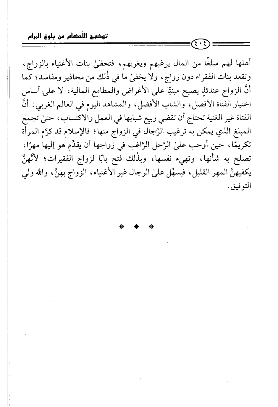 أهلها لهم مبلغًا من المال يرغبهم ويغريهم، فتحظى بنات الأغنياء بالزواج، وتقعد بنات الفقراء دون زواج، ولا يخفى ما فى ذلك من محاذير ومفاسد؛ كما أنَّ الزواج عندئذٍ يصبح مبنيًّا على الأغراض والمطامع المالية، لا على أساس اختيار الفتاة الأفضل، والشاب الأفضل، والمشاهد اليوم في العالم الغربي: أنَّ الفتاة غير الغنية تحتاج أن تقضي ربيع شبابها في العمل والاكتساب، حتى تجمع المبلغ الذي يمكن به ترغيب الرِّجال في الزواج منها؛ فالإسلام قد كرَّم المرأة تكريمًا، حين أوجب على الرَّجل الرَّاغب في زواجها أن يقدِّم هو إليها مهرًا، تصلح به شأنها، وتهيء نفسها، وبذلك فتح بابًا لزواج الفقيرات؛ لأنَّهنَّ يكفيهنَّ المهر القليل، فيسهِّل على الرجال غير الأغنياء، الزواج بهنَّ، والله ولي التوفيق.