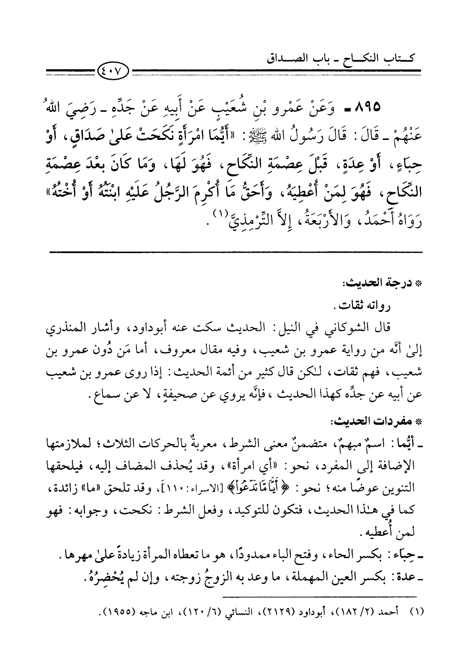 895 - وَعَنْ عَمْرو بْنِ شعَيْبٍ عَنْ أَبِيهِ عَنْ جَدِّهِ -رَضِيَ اللهُ عَنْهُمْ- قَالَ: قَالَ رَسُولُ الله -صلى الله عليه وسلم-: "أَيُّمَا امْرَأَةٍ نَكَحَتْ عَلى صَدَاقٍ، أوْ حِبَاءٍ، أَوْ عِدَةٍ، قَبْلَ عِصْمَةِ النِّكَاحِ، فَهُوَ لَهَا، وَمَا كَانَ بعْدَ عِصْمَةِ النِّكَاح، فَهُوَ لِمَنْ أُعْطِيَهُ، وَأَحَقُّ مَا أُكْرِمَ الرَّجُلُ عَلَيْهِ ابْنَتُهُ أَوْ أُخْتُهُ" رَوَاهُ أحْمَدُ، وَالأَرْبَعَةُ، إِلاَّ التِّرْمِذِيَّ (¬1).