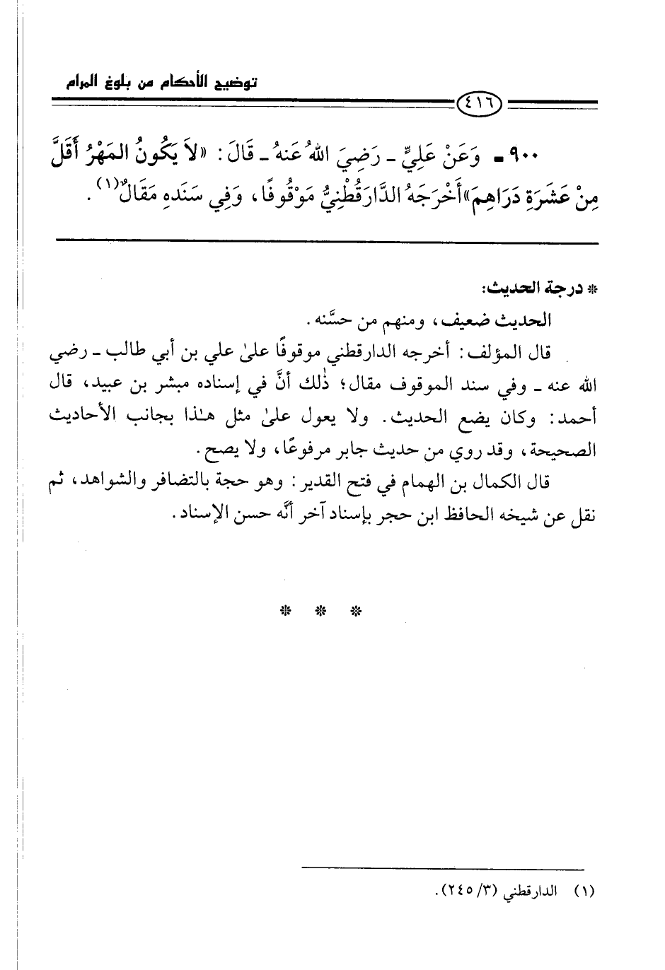 900 - وَعَنْ عَلِيٍّ -رَضِيَ اللهُ عَنهُ- قَالَ: "لاَ يَكُونُ المَهْرُ أَقَلَّ مِنْ عَشَرَةِ دَرَاهِمَ" أَخْرَجَهُ الدَّارَقُطْنِيُّ مَوْقُوفًا، وَفِي سَنَدهِ مَقَالٌ (¬1).