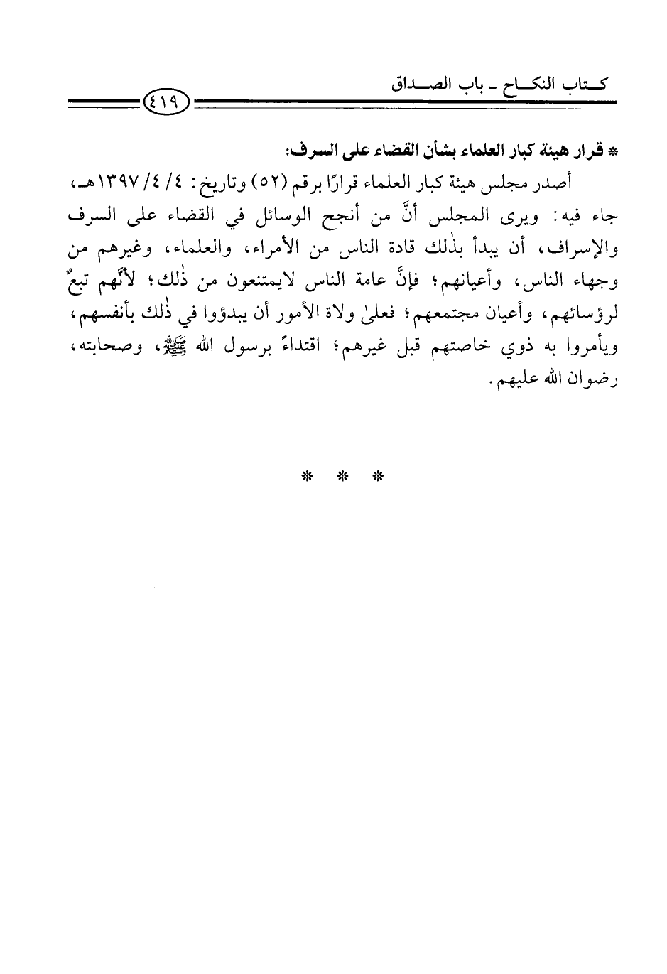 أصدر مجلس هيئة كبار العلماء قرارًا برقم (52) وتاريخ: 4/ 4/ 1397 هـ، جاء فيه: ويرى المجلس أنَّ من أنجح الوسائل في القضاء على السرف والإسراف، أن يبدأ بذلك قادة الناس من الأمراء، والعلماء، وغيرهم من وجهاء الناس، وأعيانهم؛ فإنَّ عامة الناس لايمتنعون من ذلك؛ لأنَّهم تبعٌ لرؤسائهم، وأعيان مجتمعهم؛ فعلى ولاة الأمور أن يبدؤوا في ذلك بأنفسهم، ويأمروا به ذوي خاصتهم قبل غيرهم؛ اقتداءً برسول الله -صلى الله عليه وسلم-، وصحابته، رضوان الله عليهم.