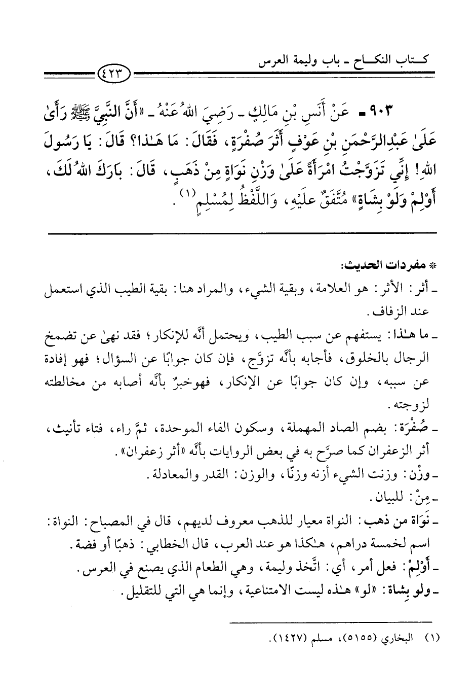 903 - عَنْ أَنَسِ بْنِ مَالِكٍ -رَضِيَ اللهُ عَنْهُ- "أَنَّ النَّبِيَّ -صلى الله عليه وسلم- رأى عَلَى عَبْدِ الرَّحْمَنِ بْنِ عَوْفٍ أَثَرَ صُفْرَةٍ، فَقَالَ: مَا هَذا؟ قَالَ: يَا رَسُولَ اللهِ! إِنِّي تَزَوَّجْتُ امْرَأَةً عَلَى وَزْنِ نَوَاةٍ مِنْ ذَهَبٍ، قَالَ: بَارَكَ اللهُ لَكَ، أَوْلِمْ وَلَوْ بِشَاةٍ" مُتَّفَقٌ علَيْهِ، وَاللَّفْظُ لِمُسْلِمٍ (¬1).