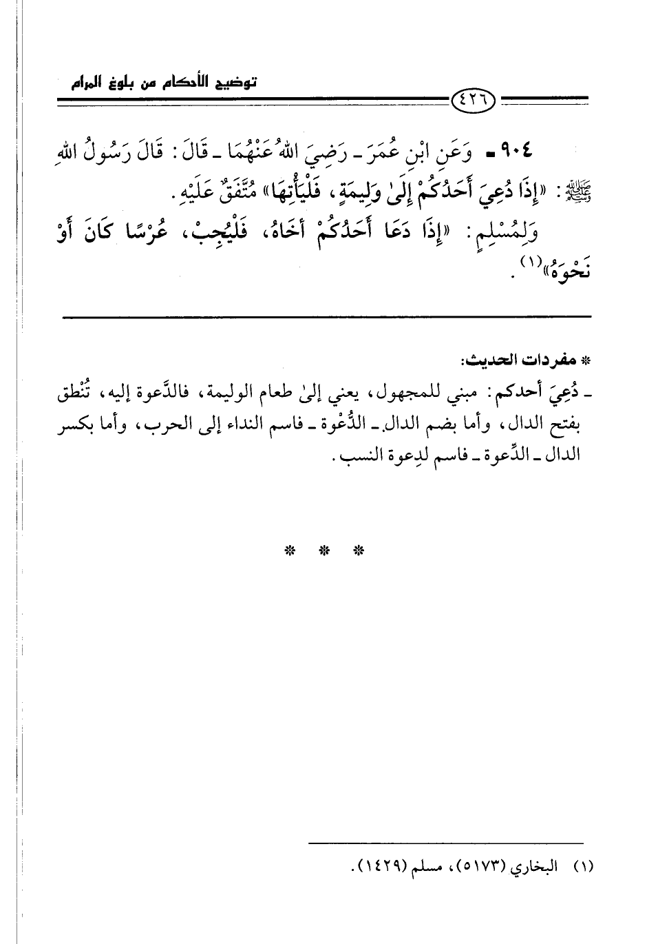 904 - وَعَنِ ابْنِ عُمَرَ -رَضِيَ اللهُ عَنْهُمَا- قَالَ: قَالَ رَسُولُ اللهِ -صلى الله عليه وسلم-: "إِذَا دُعِيَ أَحَدُكُمْ إِلَى وَلِيمَةٍ، فَلْيَأْتِهَا" مُتَّفَقٌ عَلَيْهِ.