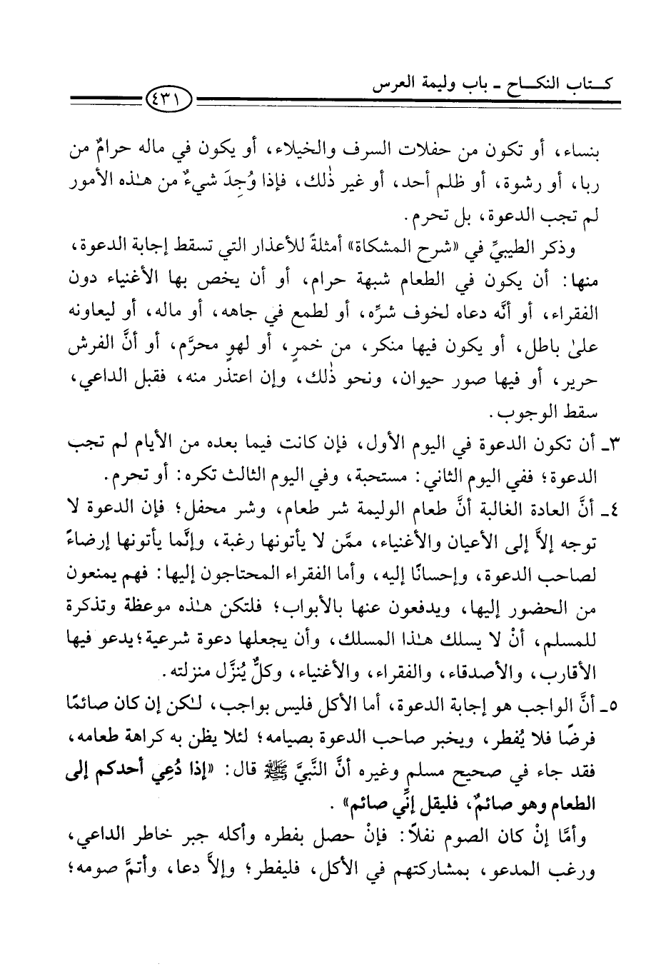 4 - أنَّ العادة الغالبة أنَّ طعام الوليمة شر طعام، وشر محفل؛ فإن الدعوة لا توجه إلاَّ إلى الأعيان والأغنياء، ممَّن لا يأتونها رغبة، وإنَّما يأتونها إرضاءً لصاحب الدعوة، وإحسانًا إليه، وأما الفقراء المحتاجون إليها: فهم يمنعون من الحضور إليها، ويدفعون عنها بالأبواب؛ فلتكن هذه موعظة وتذكرة للمسلم، أنْ لا يسلك هذا المسلك، وأن يجعلها دعوة شرعية؛ يدعو فيها الأقارب، والأصدقاء، والفقراء، والأغنياء، وكلٌّ يُنزَّل منزلته.