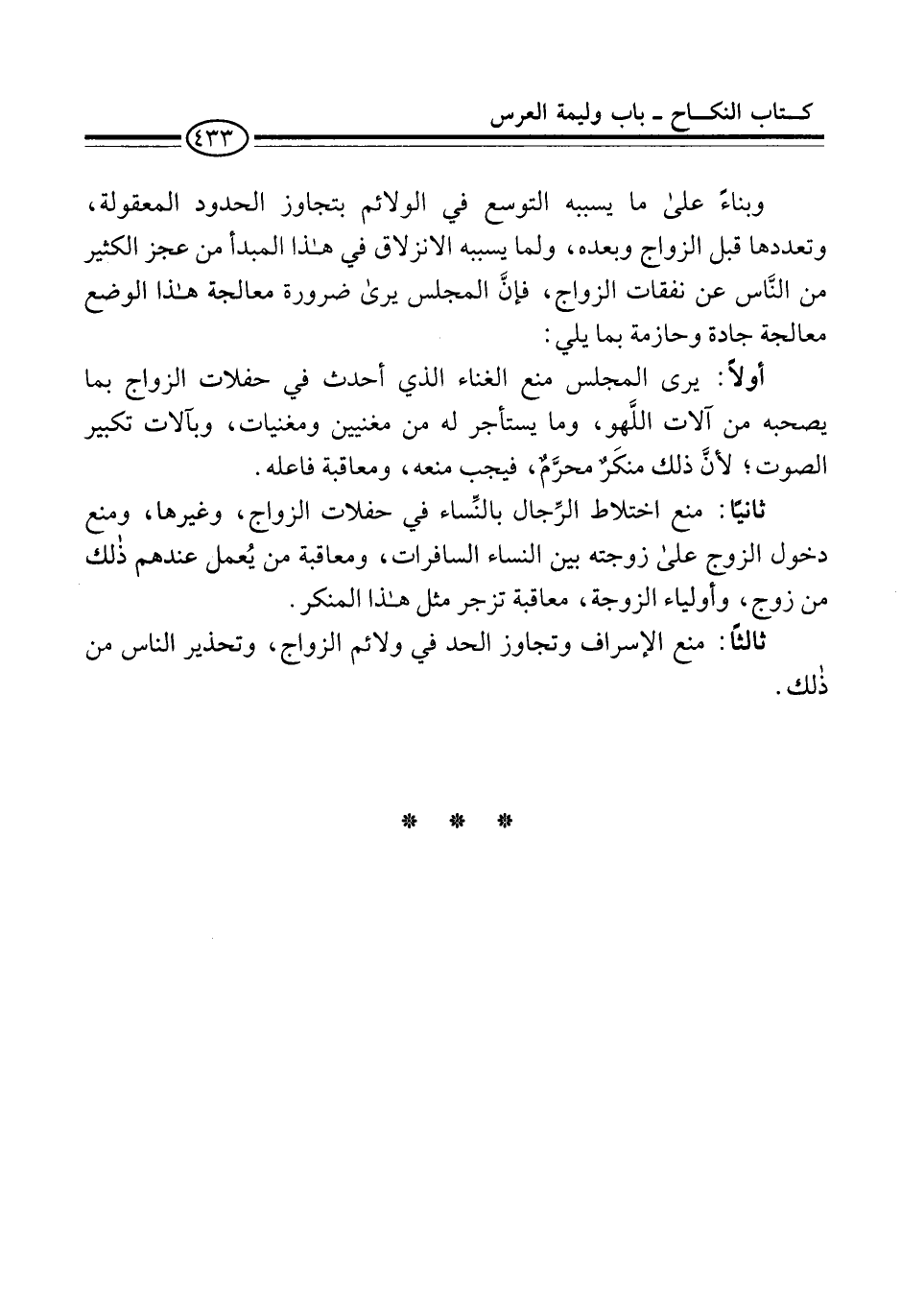 وبناءً على ما يسببه التوسع في الولائم بتجاوز الحدود المعقولة، وتعددها قبل الزواج وبعده، ولما يسببه الانزلاق في هذا المبدأ من عجز الكثير من النَّاس عن نفقات الزواج، فإنَّ المجلس يرى ضرورة معالجة هذا الوضع معالجة جادة وحازمة بما يلي: