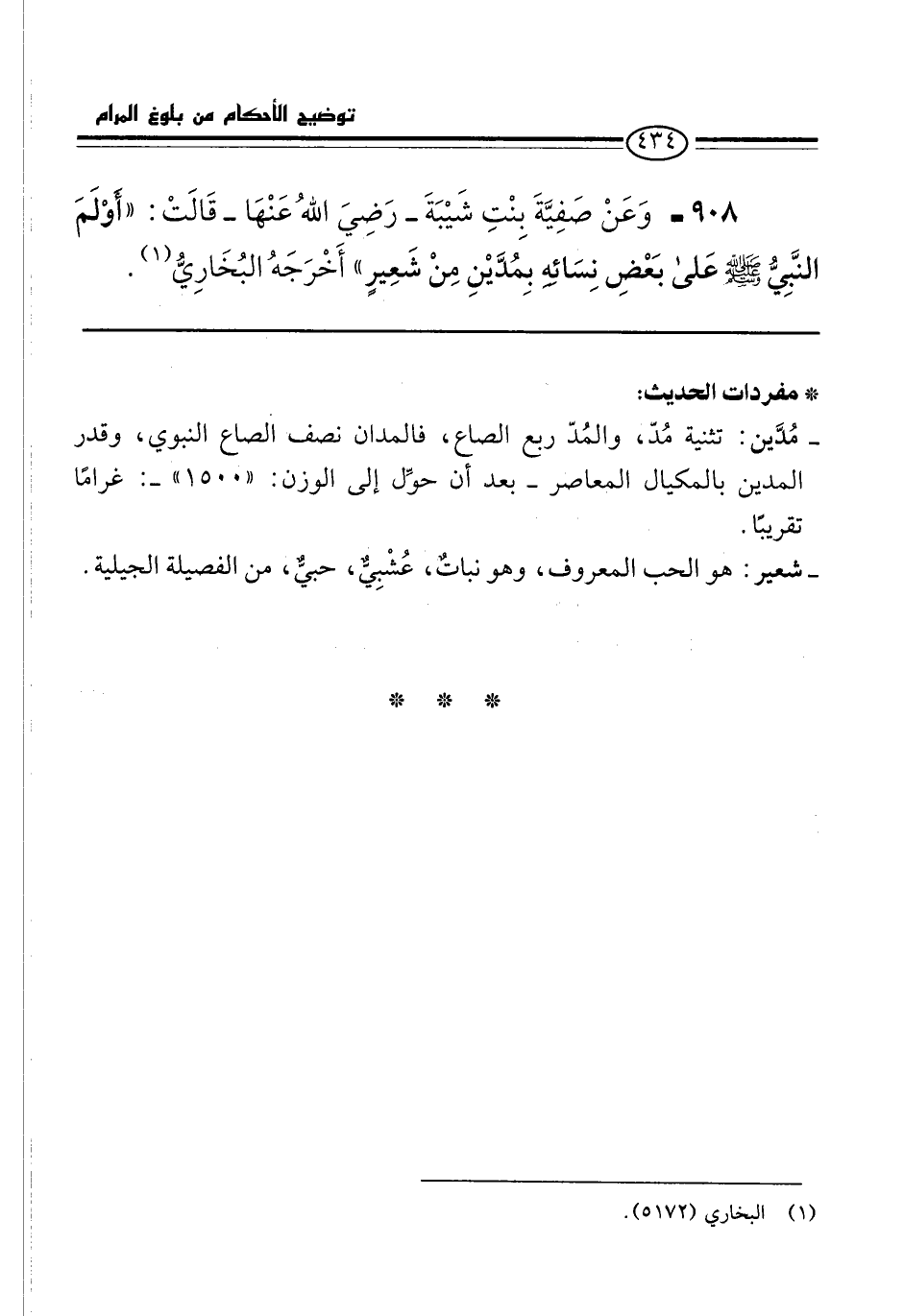 908 - وَعَنْ صَفِيَّةَ بِنْتِ شَيْبَةَ -رَضِيَ اللهُ عَنْهَا- قَالَتْ: "أَوْلَمَ النَّبِيُّ -صلى الله عليه وسلم- على بَعْضِ نِسَائِهِ بِمُدَّيْنِ مِنْ شَعِيرٍ" أَخْرَجَهُ البُخَارِيُّ (¬1).