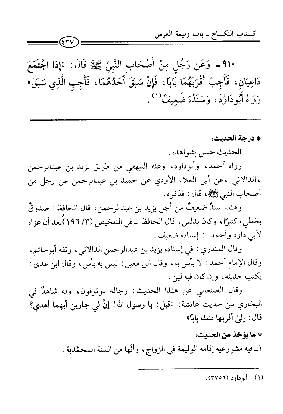 910 - وَعَن رَجُلٍ مِنْ أَصْحَابِ النَّبِيِّ -صلى الله عليه وسلم- قَالَ: "إِذا اجْتَمَعَ دَاعِيَانِ، فَأَجِبْ أقْرَبَهُمَا بَابًا، فَإِنْ سَبَقَ أَحَدُهُمَا، فَأَجِبِ الَّذِي سَبَقَ" رَوَاهُ أَبُو دَاوُدَ، وَسَنَدُهُ ضَعِيفٌ (¬1).