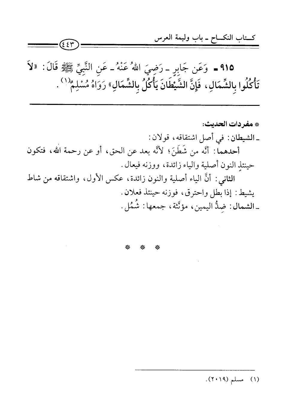 915 - وَعَن جَابِرٍ -رَضيَ اللهُ عَنْهُ- عَنِ النَّبِيِّ -صلى الله عليه وسلم- قَالَ: "لاَ تَأْكُلُوا بِالشِّمَالِ، فَإِنَّ الشَّيْطَانَ يَأْكُلُ بِالشِّمَالِ" رَوَاهُ مُسْلِمٌ (¬1).