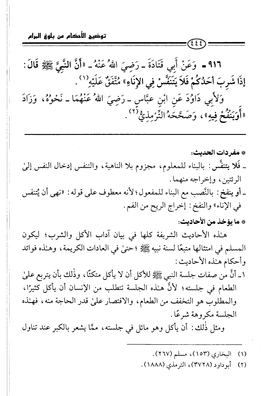 916 - وَعَنْ أَبِي قتادَةَ -رَضِيَ اللهُ عَنْهُ- "أَنَّ النَّبيَّ -صلى الله عليه وسلم- قَالَ: إذَا شَرِبَ أحَدُكُمْ فَلاَ يَتَنَفَّسْ فِي الإِنَاءَ" مُتَّفَقٌ عَلَيْهِ (¬1).