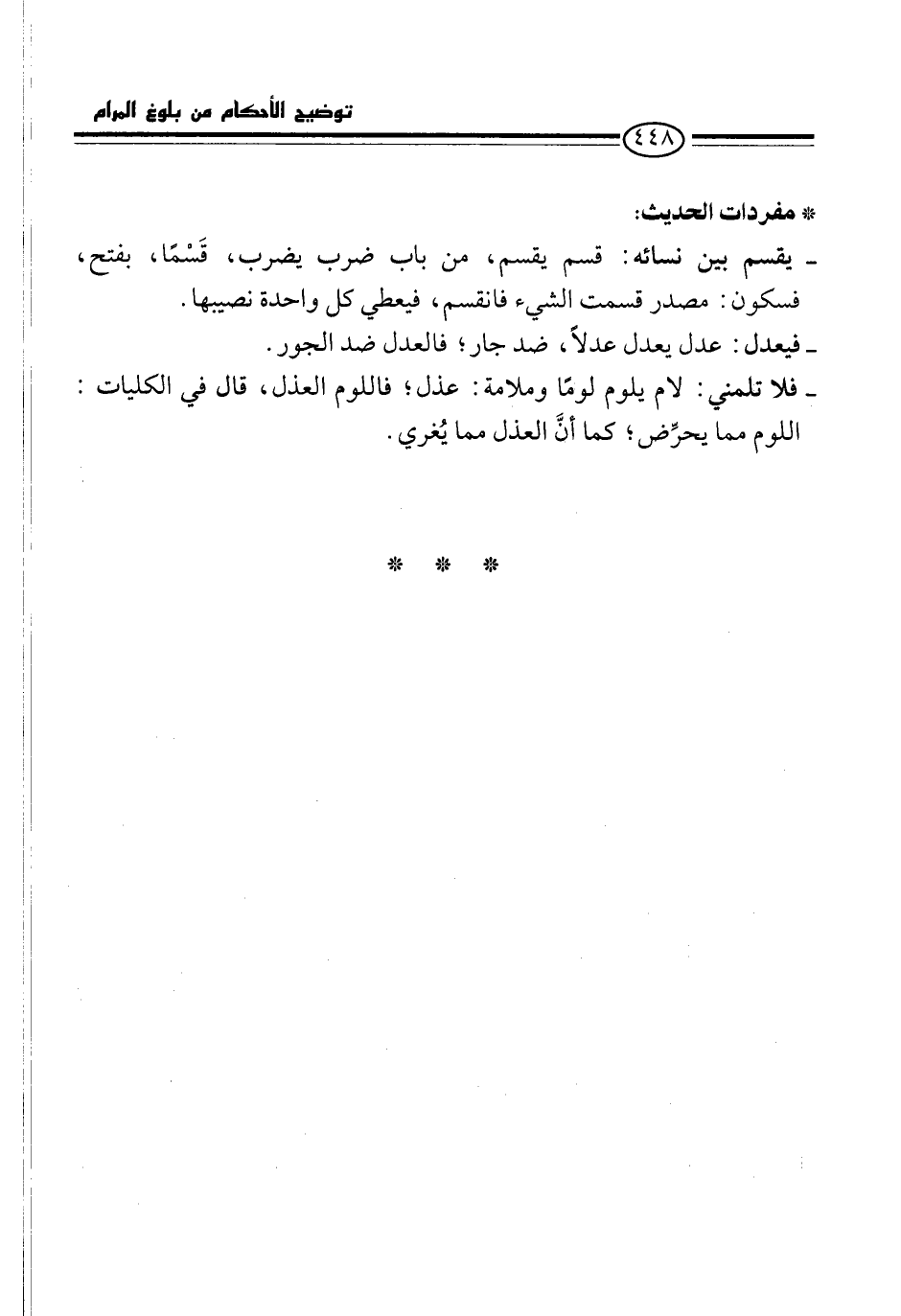 - يقسم بين نسائه: قسم يقسم، من باب ضرب يضرب، قَسْمًا، بفتح، فسكون: مصدر قسمت الشيء فانقسم، فيعطي كل واحدة نصيبها.