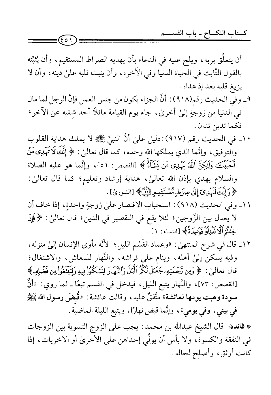 11 - وفي الحديث (918): استحباب الاقتصار علها زوجةٍ واحدةٍ، إذا خاف إن لا يعدل بين الزَّوجين؛ لئلا يقع في التقصير في الدين؛ قال تعالى: {فَإِنْ خِفْتُمْ أَلَّا تَعْدِلُوا فَوَاحِدَةً} [النساء: 3].