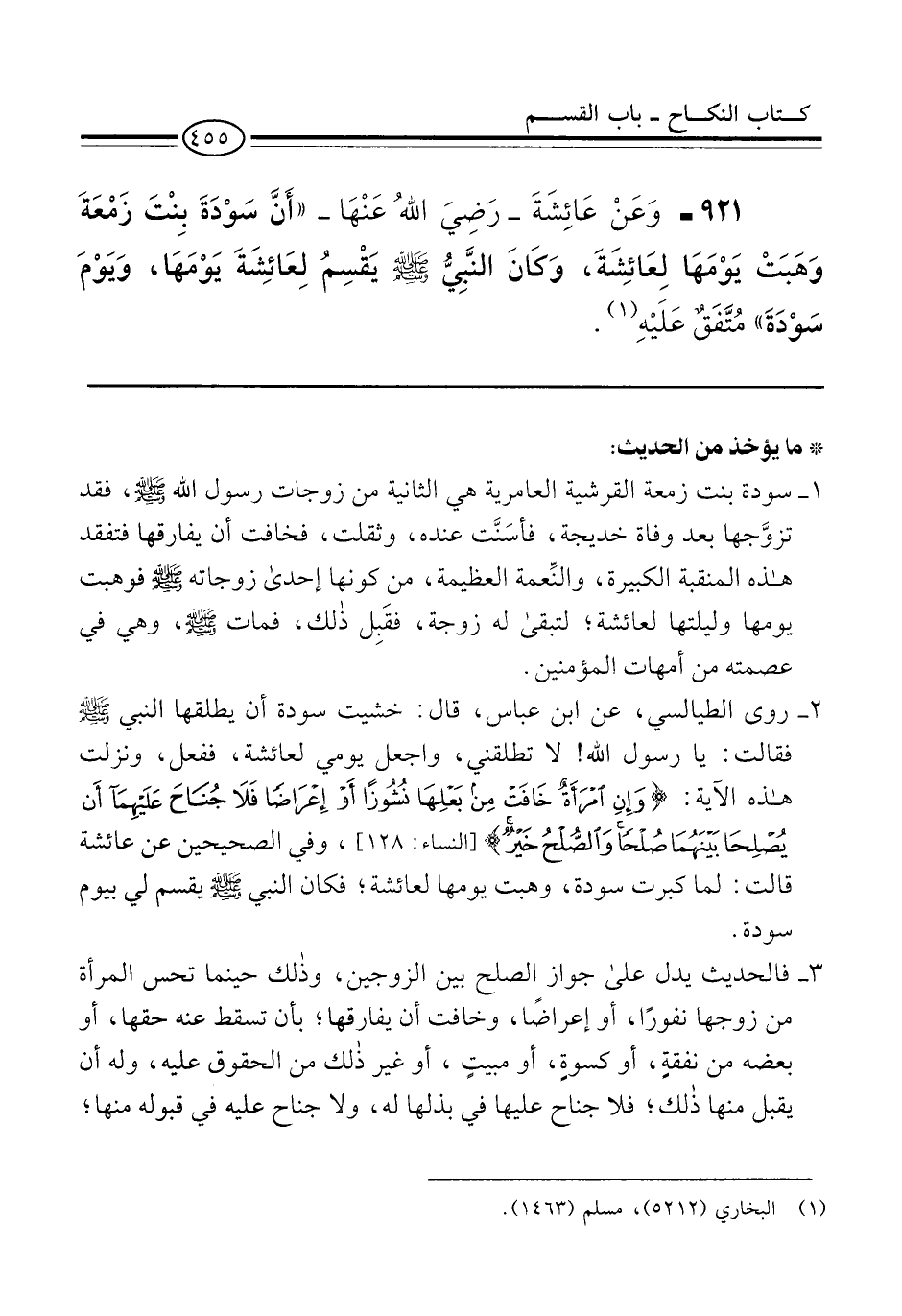 921 - وَعَنْ عَائِشَةَ -رَضِيَ اللهُ عَنْهَا- "أَنَّ سَوْدَةَ بِنْتَ زَمْعَةَ وَهَبَتْ يَوْمَهَا لِعَائشَةَ، وَكَانَ النَّبِيُّ -صلى الله عليه وسلم- يَقْسِمُ لِعَائشَةَ يَوْمَهَا، وَيَوْمَ سوْدَةَ" مُتَّفَقٌ عَلَيْهِ (¬1).