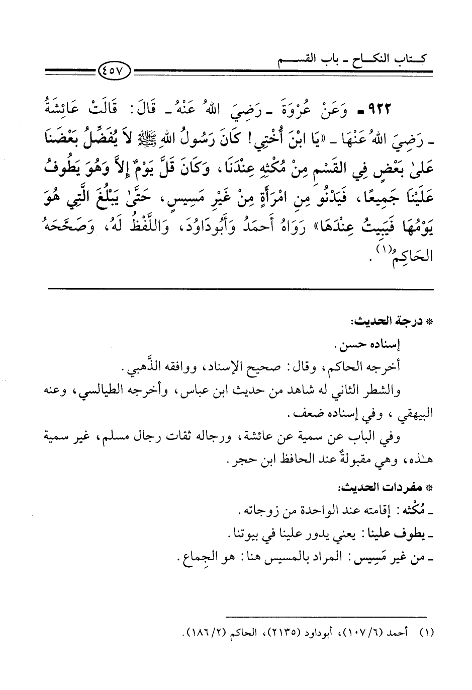 922 - وَعَنْ عُرْوَةَ -رَضِيَ اللهُ عَنْهُ- قَالَ: قَالَتْ عَائِشَةُ -رَضِيَ اللهُ عَنْهَا- "يَا ابْنَ أُخْتِي! كَانَ رَسُولُ اللهِ -صلى الله عليه وسلم- لاَ يُفَضِّلُ بَعْضَنَا عَلى بَعْضٍ فى القَسْمِ مِنْ مُكْثِهِ عِنْدَنَا، وَكَانَ قَلَّ يَوْمٌ إِلاَّ وَهُوَ يَطُوفُ عَلَيْنَا جَمِيعًا، فَيَدْنُو مِنِ امْرَأَةٍ مِنْ غَيْرِ مَسِيسٍ، حَتَّى يَبْلُغَ الَّتِي هُوَ يَوْمُهَا فَيَبِيتُ عِنْدَهَا" رَوَاهُ أَحمَدُ وَأَبُو دَاوُدَ، وَاللَّفْظُ لَهُ، وَصَحَّحَهُ الحَاكِمُ (¬1).