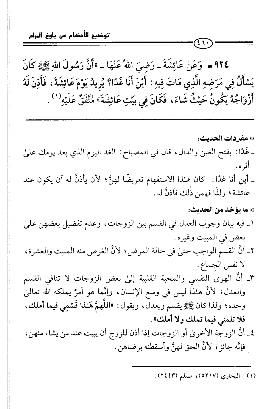 924 - وَعَنْ عَائِشَةَ -رَضِيَ اللهُ عَنْهَا- "أَنَّ رَسُولَ اللهِ -صلى الله عليه وسلم- كَانَ يَسْأَلُ فِي مَرَضِهِ الَّذِي مَاتَ فِيهِ: أَيْنَ أَنَا غَدًا؟ يُرِيدُ يَوْمَ عَائشِةَ، فَأَذِنَ لَهُ أَزْوَاجُهُ يَكُونُ حَيْثُ شَاءَ، فَكَانَ فِي بَيْتِ عَائِشَةَ" مُتَّفَقٌ عَلَيْهِ (¬1).