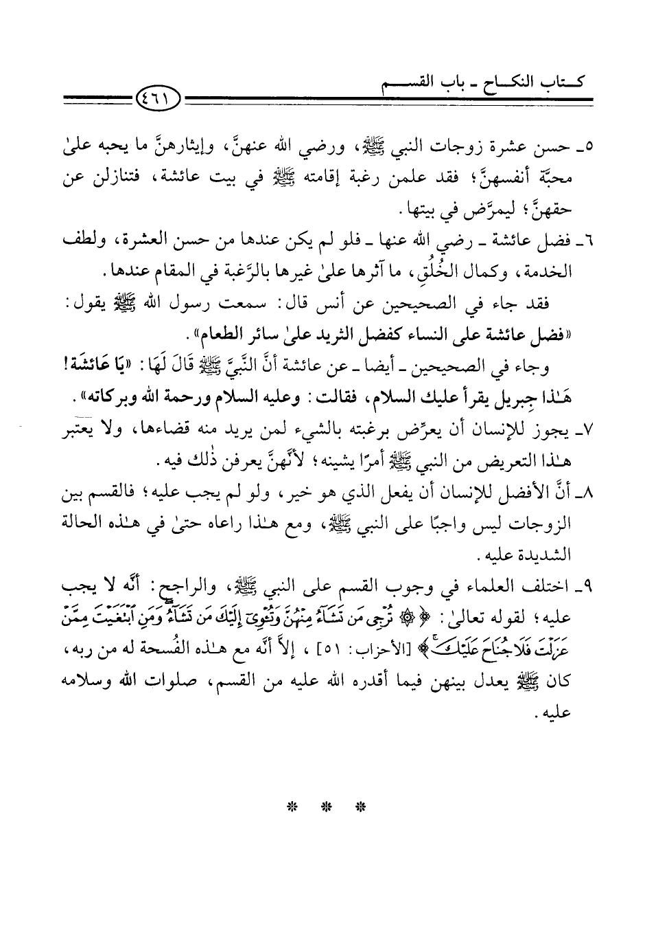9 - اختلف العلماء في وجوب القسم على -صلى الله عليه وسلم-، والراجح: أنَّه لا يجب عليه؛ لقوله تعالى: {تُرْجِي مَنْ تَشَاءُ مِنْهُنَّ وَتُؤْوِي إِلَيْكَ مَنْ تَشَاءُ وَمَنِ ابْتَغَيْتَ مِمَّنْ عَزَلْتَ فَلَا جُنَاحَ عَلَيْكَ} [الأحزاب:51]، إلاَّ أنَّه مع هذا الفُسحة له من ربه، كان -صلى الله عليه وسلم- يعدل بينهن فيما أقدره الله عليه من القسم، صلوات الله وسلامه عليه.