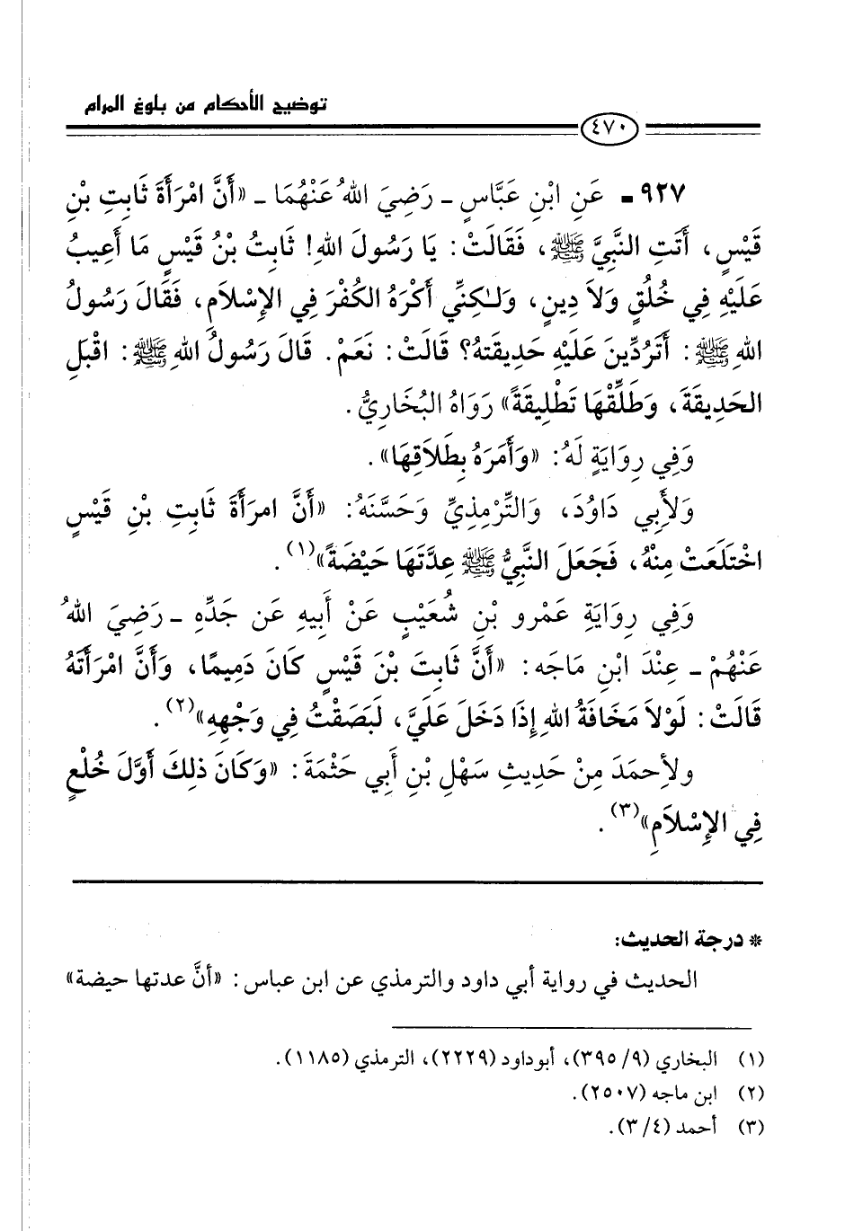 927 - عَنِ ابْنِ عَبَّاسٍ -رَضِيَ اللهُ عَنْهُمَا- "أَنَّ امْرَاةَ ثَابِتِ بْنِ قَيْسٍ، أَتَتِ النَّبِيَّ -صلى الله عليه وسلم-، فَقَالَتْ: يَا رَسُولَ اللهِ! ثَابِتُ بْنُ قَيْسٍ مَا أَعِيبُ عَلَيْهِ فِي خُلُقٍ وَلاَ دِينٍ، وَلكِنِّي أَكْرَهُ الكُفْرَ فِي الإِسْلاَمِ، فَقَالَ رَسُولُ اللهِ -صلى الله عليه وسلم-: أَتَرُدِّينَ عَلَيْهِ حَدِيقَتهُ؟ قَالَتْ: نَعَمْ. قَالَ رَسُولُ اللهِ -صلى الله عليه وسلم-: اقْبلِ الحَدِيقَةَ، وَطَلِّقْهَا تَطْلِيقَةً" رَوَاهُ البُخَارِيُّ.