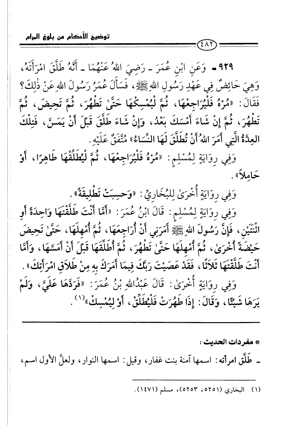 929 - وَعَنِ ابْنِ عُمَرَ -رَضِيَ اللهُ عَنْهُمَا- أَنَّهُ طَلَّقَ امْرَأَتَهُ، وَهِيَ حَائِضٌ عَهْدِ رَسُولِ اللهِ -صلى الله عليه وسلم-، فَسَأَلَ عُمَرُ رَسُولَ اللهِ عَنْ ذلِكَ؟ فَقَالَ: "مُرْهُ فَلْيُرَاجِعْهَا، ثُمَّ لْيُمْسِكْهَا حَتَّى تَطْهُرَ، تُمَّ تَحِيضَ، ثُمَّ تَطْهُرَ، ثُمَّ إِنْ شَاءَ أَمْسَكَ بَعْدُ، وَإِنْ شَاءَ طَلَّقَ قَبْلَ أَنْ يَمَسَّ، فَتِلْكَ العِدَّةُ الَّتِي أَمَرَ اللهُ أَنْ تُطَلَّقَ لَهَا النِّسَاءُ" مُتَّفَقٌ عَلَيْهِ.