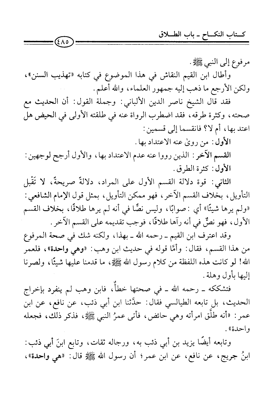 وقد اعترف ابن القيم -رحمه الله- بهذا، ولكنه شك في صحة المرفوع من هذا القسم، فقال: وأمَّا قوله في حديث ابن وهب: "وهي واحدة"، فلعمر الله! لو كانت هذه اللفظة من كلام رسول الله -صلى الله عليه وسلم-، ما قدمنا عليها شيئًا، ولصرنا إليها بأول وهلة.